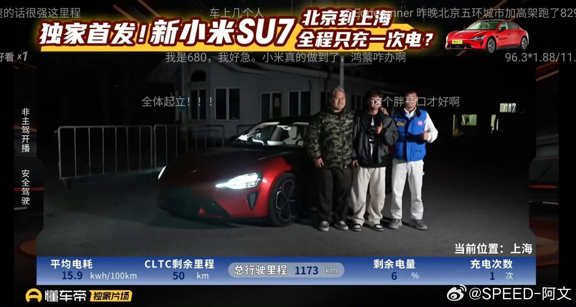 懂车帝实测小米新一代SU7北京-上海全程1173公里,只充一次电。只能说确实有点