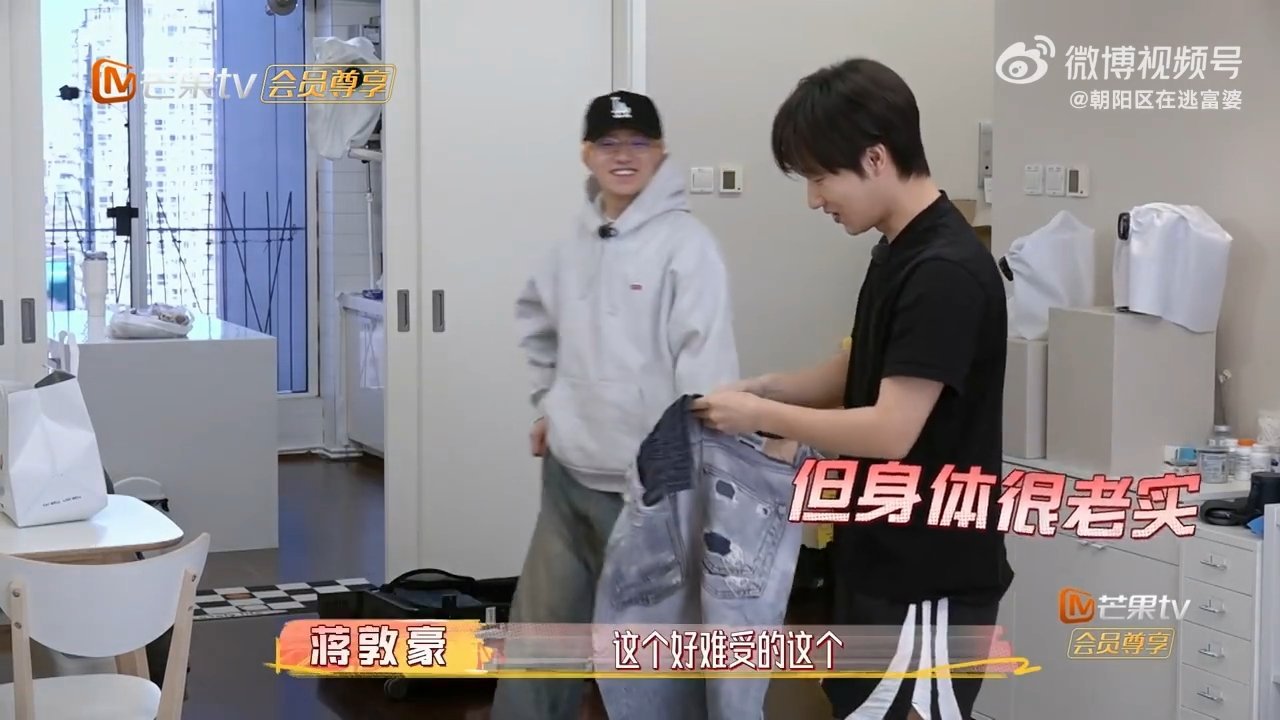 蒋敦豪穿上吊裆裤不会走路蒋敦豪被王一珩带着换穿搭,还穿上了吊裆裤,走路姿势都跟着