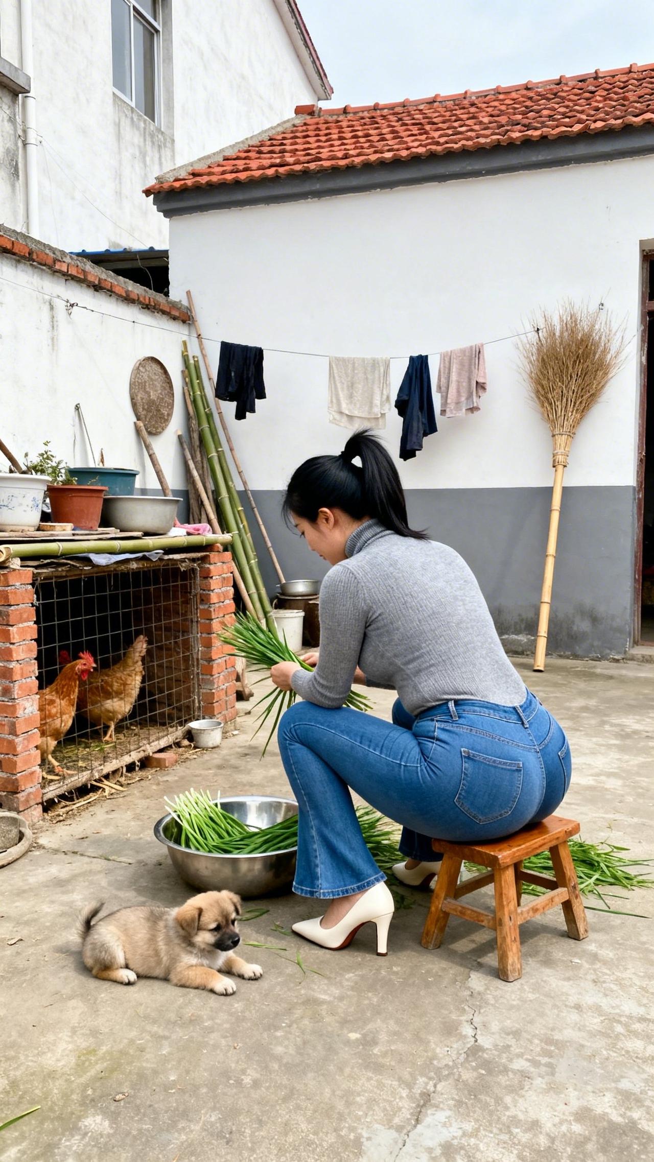 庭院的风裹着烟火气漫过,指尖轻理鲜翠的青韭,把日常的温柔揉进每一片叶瓣里。檐下鸡群闲踱,幼犬在脚边安然蜷卧,木凳与旧屋承载着乡居的踏实,将这份择菜的细碎时光,晕染成最动人的诗意。阳光在院坝洒下暖光,水珠在叶尖轻颤,把烟火人间的安然与松弛,都酿成心底最踏实的暖意,让时光在这一方小院里慢慢流淌,沉淀出岁月最温柔的模样,给寻常日子添上一抹治愈的清甜。农村