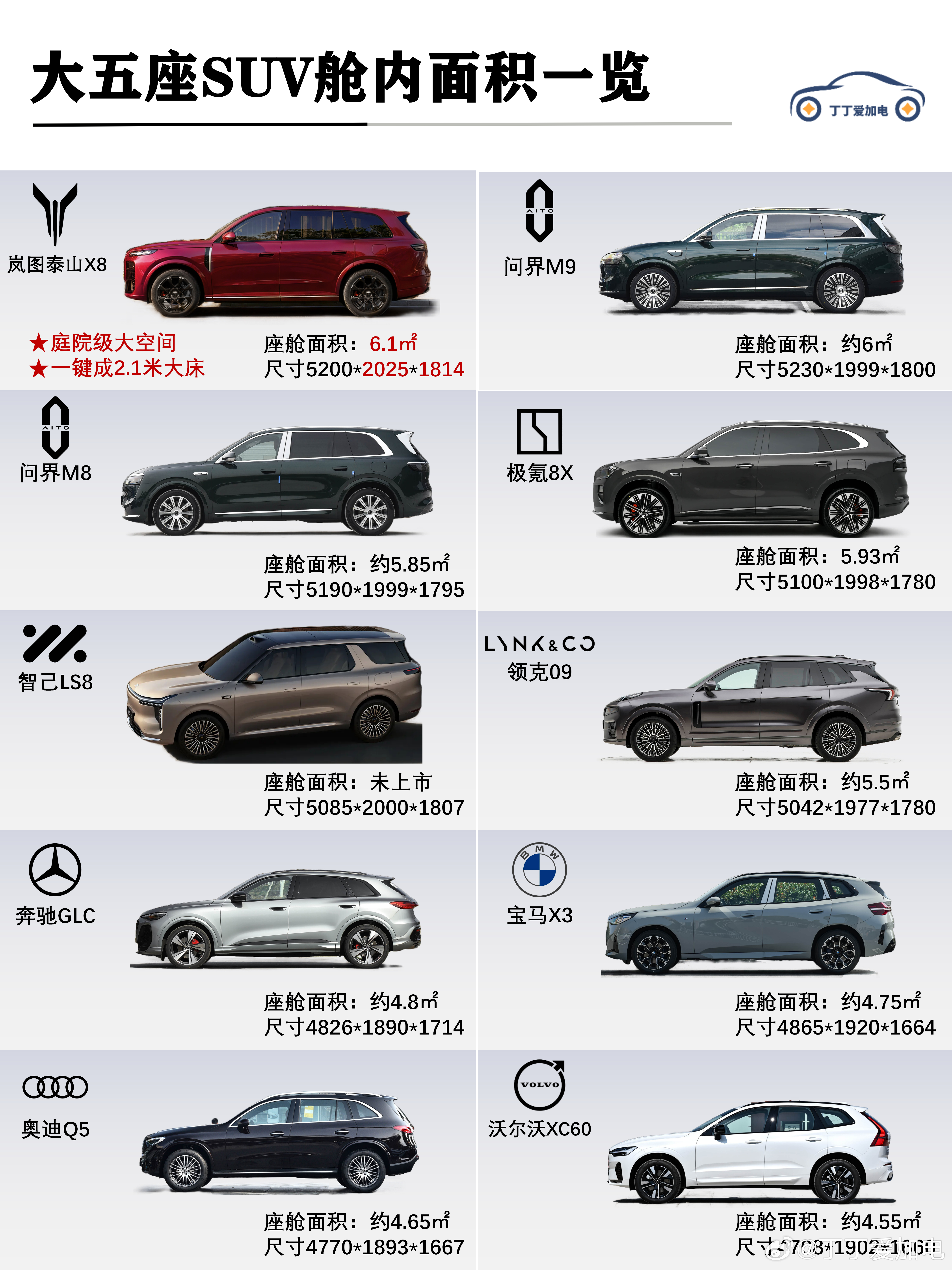 ●先说说空间表现。在这10款同级车型中,国内新能源品牌的尺寸空间基本优于传统豪华品牌。其中又以岚图泰山X8、问界M9和M8占优,而岚图泰山X8在车身宽度和高度方面又略胜一筹。最让人惊喜的是,泰山X8的车内座舱空间居然达到6.1平米,什么概念?等于是把一个小庭院或者是一个小房间搬到了车上。而且还是五座SUV率先搭载二排双享零重力座椅,这坐上去不知道有多舒服,没有两秒钟就能进入甜甜梦想。你要是觉得在座椅上睡觉不像躺在床上,那有办法,车内可以一键铺放一张2.1m的纯平大床,这样你就能在车上感受到在家里大床上睡觉的感觉,美翻了啊。其实六座SUV目前普遍存在一个痛点就是六座车普遍后备箱空间不大。小编认为如果六座不是刚需,泰山X8、极氪8X这种大五座SUV,非常适合长途自驾露营,既能保障二排乘客的绝对舒适,后备箱放婴儿车+露营装备也毫无压力,不失为一种更优的选择。