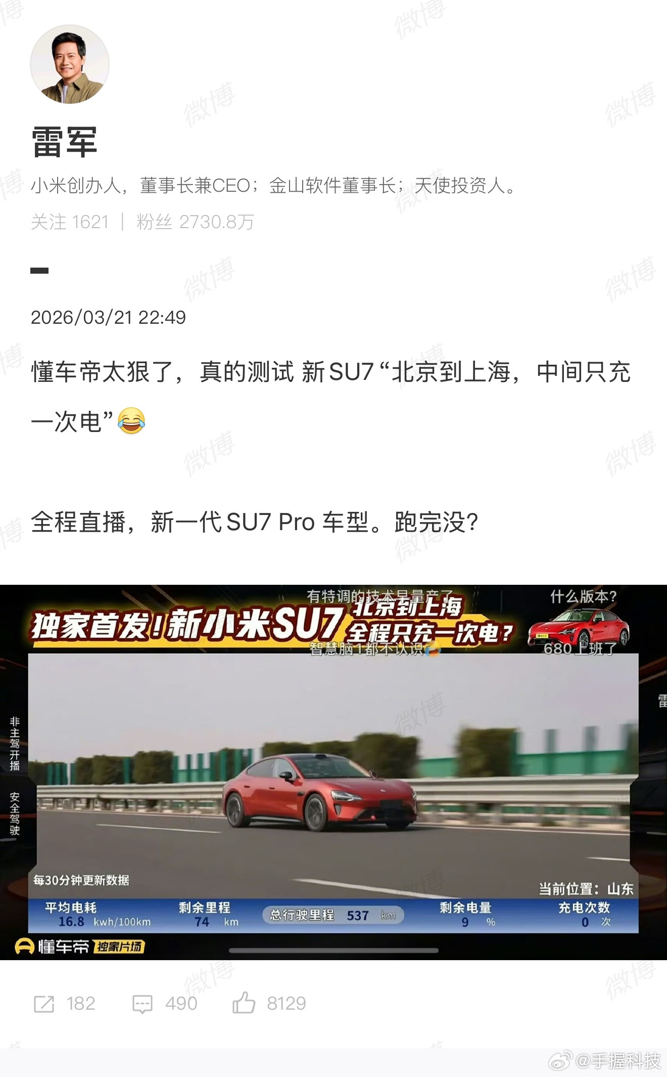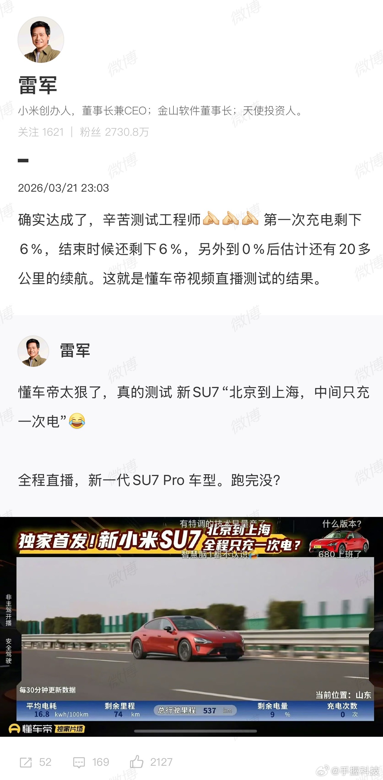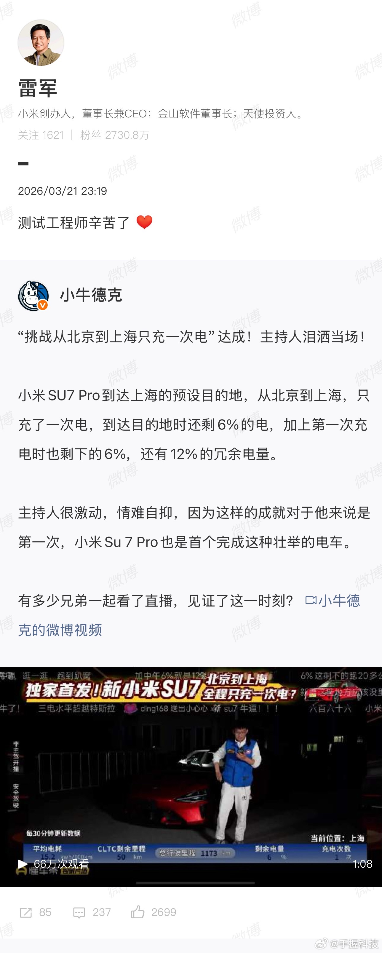 新SU7北京开到上海仅充1次电以前有多少人和我一样,觉得电车跑跨省高速那纯纯是一场冒险,要不停规划充电桩,还要担心电量不够。所以才会在看到这次新SU7直接把1173公里的路程,用一次充电就走完了,有多震撼!全程三个人满载,空调正常开,完全没有刻意去省电开,到终点还能剩下6%的电,这在以前不敢想的吧?行业里第一次有纯电车公开完成这个挑战,意义是不一样的,它把大家对电车的焦虑打消了一大半。平均电耗15.2kWh/100km,还留有12%的冗余电量,甚至优化一下驾驶习惯,而且理论续航还能更高。雷军也专门发文感谢测试团队,也能看出来整个团队对这次实测的重视。以后再开电车跑像北京到上海这种长途,真不用像以前那样麻烦和担心了。所以说这次实测,不仅仅是新SU7的一次证明,也是整个国产纯电向前迈出的一大步啊!雷军回应媒体北京上海高速续航实测