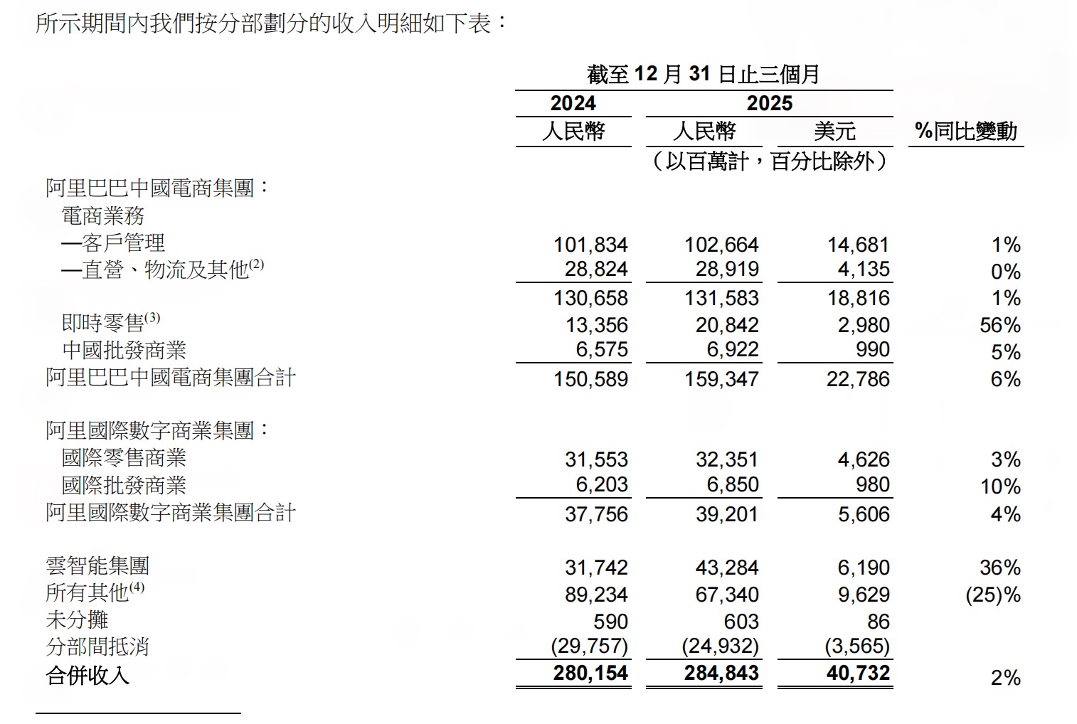 “所有其他”业务(包括盒马、菜鸟、阿里健康、虎鲸文娱集团、高德、千问C端事业群、灵犀互娱、钉钉和其他业务)收入为673.40亿元,同比减少25%。该业务主要是由于处置高鑫零售和银泰业务导致的收入下降,以及菜鸟的收入下降所致,部分被盒马和阿里健康的收入增长所抵销。