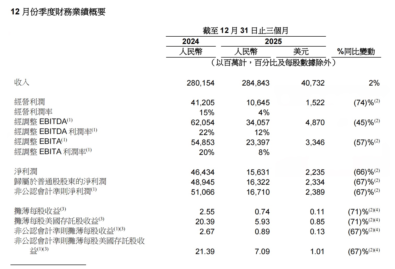 2025年第四季度,阿里巴巴收入达2848.43亿元,同比增长2%。若不考虑高鑫零售和银泰的已处置业务的收入,同口径收入同比增长将为9%。净利润为156.31亿元,同比下降66%,主要是由于经营利润的减少所致。非公认会计准则净利润167.10亿元,同比下降67%。