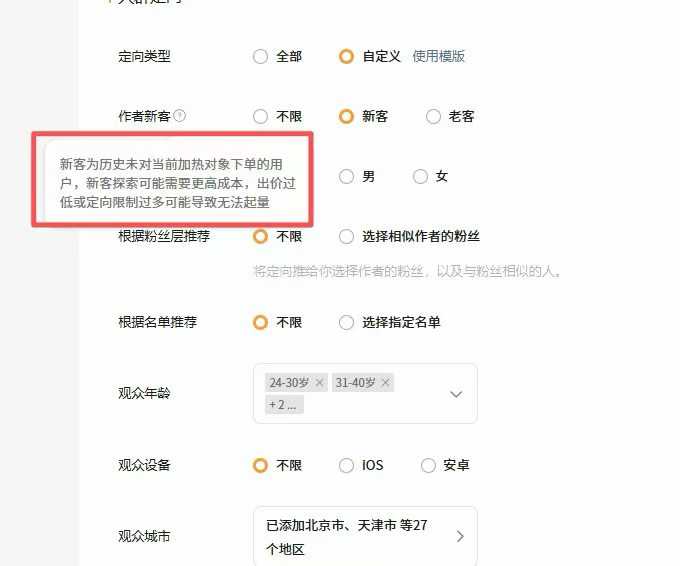 平台提示,新客探索的成本相对更高,投放时要注意出价和定向限制。出价太低或者定向条件设得太严,很容易导致投放跑不起量。有商家反馈,相比普通投放计划,“新客”需要提高出价才能起量;而且成交数据里可能存在差异,不全是真正的新客,同时还面临着退货率偏高的风险。