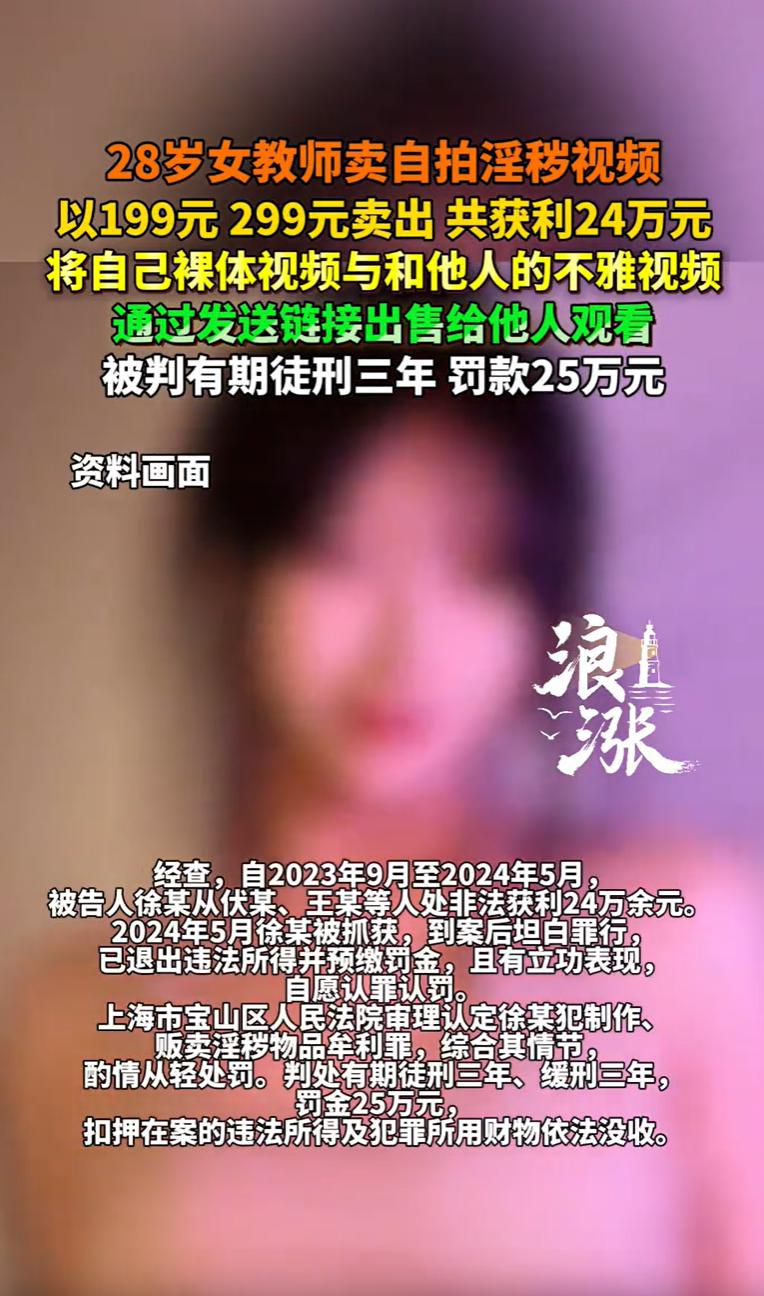 上海,一位98年出生的姑娘,原本是湖南某职业中专的教师,站在讲台上教书育人。可谁也没想到,她几年前开始在微信群里发自己的“闪照”,即那种看完几秒就销毁的照片,用这种方式吸引陌生男子加好友。等对方上钩后,她把自己拍的裸 体视频和与别人的私 密视频明码标价199元、299元,通过链接卖给别人。短短八九个月,她靠这个赚了24万多。很快,警察找上门。结果,女子从讲台上的老师成为被告席上的罪犯。 徐某1998年出生,标准的“95后”,拥有大学本科的学历,还是湖南某职业中专的一名在编教师。 然而,在这份光鲜的身份背后,另一个“徐某”却在网络的暗影中悄然滋生。 2023年9月,那时的徐某,不知是因生活压力,还是被消费主义的浪潮裹挟,又或是一时的贪念作祟,她萌生了一个危险的念头,利用自己的身 体和隐私去换取金钱。 她最初的手段颇为隐蔽,在一些微信群里,她开始发布一种叫做“闪照”的东西。 用过的人都知道,这种照片看完几秒就会自动销毁,给人一种“阅后即焚”的安全感。 她用这种方式吸引一些男性的注意,照片的内容,自然不是普通的自拍。 果然,有人上钩了,一些男性在看完“闪照”后,会主动添加她的私人微信。 就这样,徐某的微信好友列表里,逐渐多了一批“有特殊需求”的陌生人。 这些人为数不多,但都是她精准筛选过的“客户”。 当这些“客户”加为好友后,徐某才真正开始她的“生意”。她出售的东西,不是普通的商品,而是她自己拍摄的LUO体视频,以及她与别人的发生关系的视频。 这些极度私密、带有强烈感官刺激的内容,被她明码标价:199元、299元一份。 这个价格不算天价,却足以筛选出有一定消费能力的“顾客”。 交易方式也颇为“现代”,她不是直接发送视频文件,那样风险太大,容易被平台检测。 她选择发送一个微信链接,买家点击链接,就可以下载观看。 这种方式,既完成了交易,又在一定程度上增加了隐蔽性。 在她的“客户”名单里,有两个人很关键,一个叫伏某,一个叫王某,正是他们,让徐某的行为暴露在司法机关的视野之下。 经公安机关调查和专门的机构鉴定,徐某卖给伏某的视频中有9部属于淫 秽物品,卖给王某的则有24部之多。 从2023年9月到2024年5月,短短八、九个月的时间里,徐某的微信和支付宝账户里,源源不断地收到来自伏某、王某等人的转账。 经审计,她通过这种方式非法获利,竟然高达24万余元。 2024年5月31日,公安机关的侦查人员找到了她,将她抓获归案。 到案后,徐某很快便如实供述了自己的全部犯罪事实。 在案件侦查过程中,徐某还向公安机关提供了其他人涉嫌贩卖淫秽物品牟利的重要线索。 后来,侦查机关根据她提供的线索,成功侦破了另一起案件。 案发后,在徐某的家人帮助下,徐某将违法所得24万余元全部退缴,并且提前预缴了法院可能判处的罚金。 随后,区检察院以“制作、贩卖淫 秽物品牟利罪”对徐某提起公诉。 法院怎么判! 《刑法》第三百六十三条第一款之规定,以牟利为目的,制作、复制、出版、贩卖、传播淫秽物品的,处三年以下有期徒刑、拘役或者管制,并处罚金;情节严重的,处三年以上十年以下有期徒刑,并处罚金;…… 法院指出,徐某自2023年9月起,以牟利为目的,通过微信群发布“闪照”方式引流,将本人拍摄的私密视频以199元、299元价格出售,获利24万余元。 经鉴定,涉案33部视频均属淫 秽物品。 法院认为,徐某主观上具有牟利故意,客观上实施了制作及贩卖行为,符合该罪构成要件,公诉机关指控罪名成立。 不过,徐某到案后,存在多项法定和酌定的量刑情节,争取到了更轻才处罚。 《刑法》第六十七条第三款之规定,犯罪嫌疑人虽不具有前两款规定的自首情节,但是如实供述自己罪行的,可以从轻处罚。 徐某于2024年5月31日被抓获归案后,在第一次讯问中即如实供述了其制作、贩卖淫秽视频的全部犯罪事实,且此后供述稳定,未出现翻供情形,符合坦白的构成要件,依法可以从轻处罚。 《刑法》第六十八条之规定,犯罪分子有揭发他人犯罪行为,查证属实的,或者提供重要线索,从而得以侦破其他案件等立功表现的,可以从轻或者减轻处罚。 徐某到案后,主动向侦查机关提供了他人涉嫌贩卖淫秽物品牟利犯罪的重要线索,且侦查机关根据该线索经侦查,成功侦破另一起贩卖淫秽物品牟利案件,符合立功表现,依法可以从轻处罚。 此外,徐某认罪认罚,且与其家属主动向公安机关退缴了全部违法所得人民币24万余元,并主动向本院预缴了罚金人民币25万元,有积极的悔罪态度,依法可以从宽处罚。 最终,法院判处徐某有期徒刑三年,缓刑三年,并处罚金25万元。 对此,你怎么看?