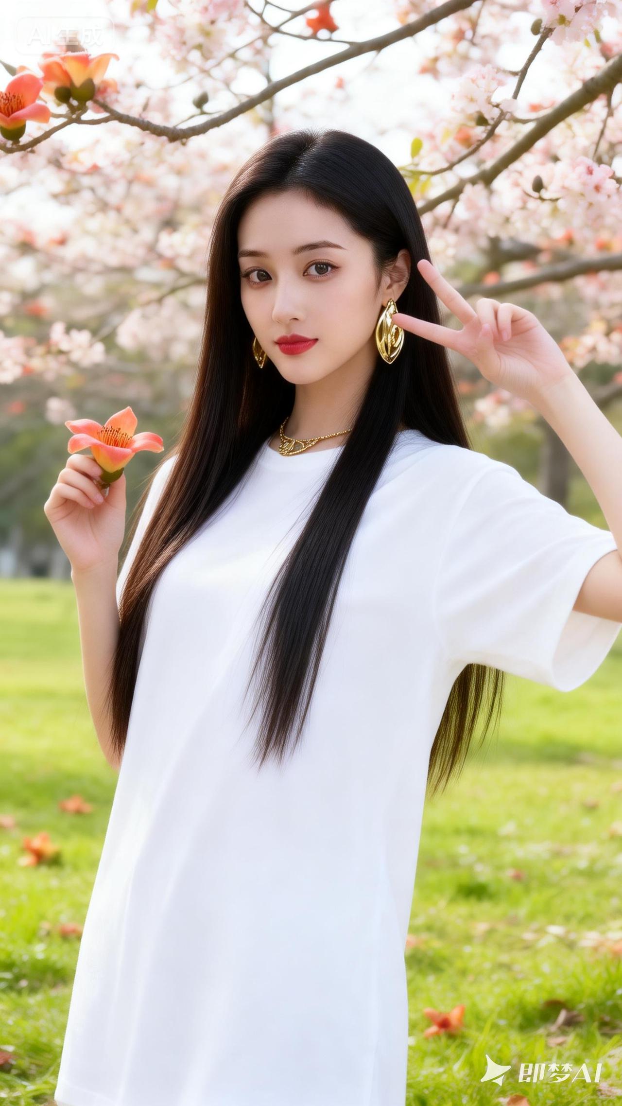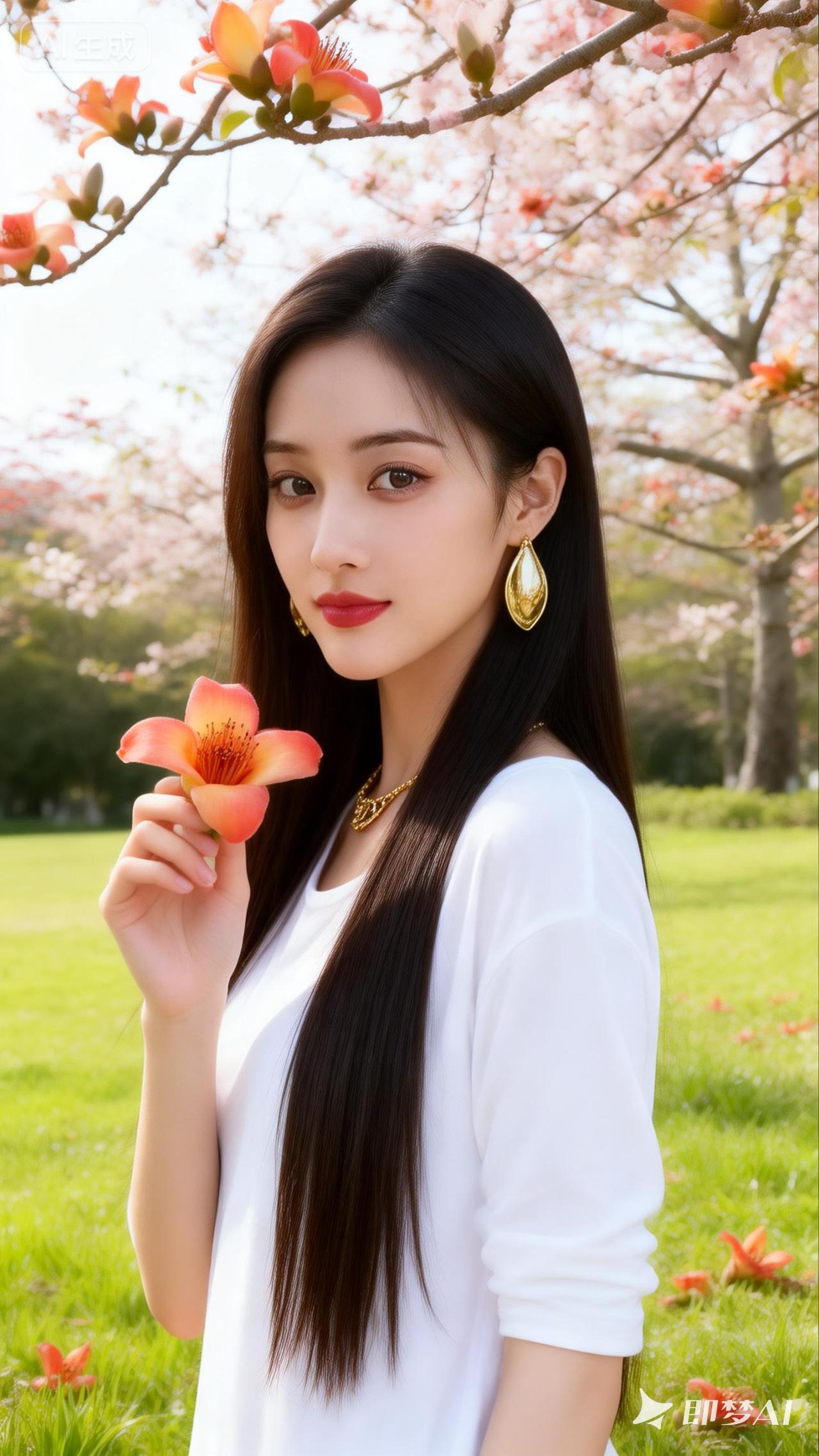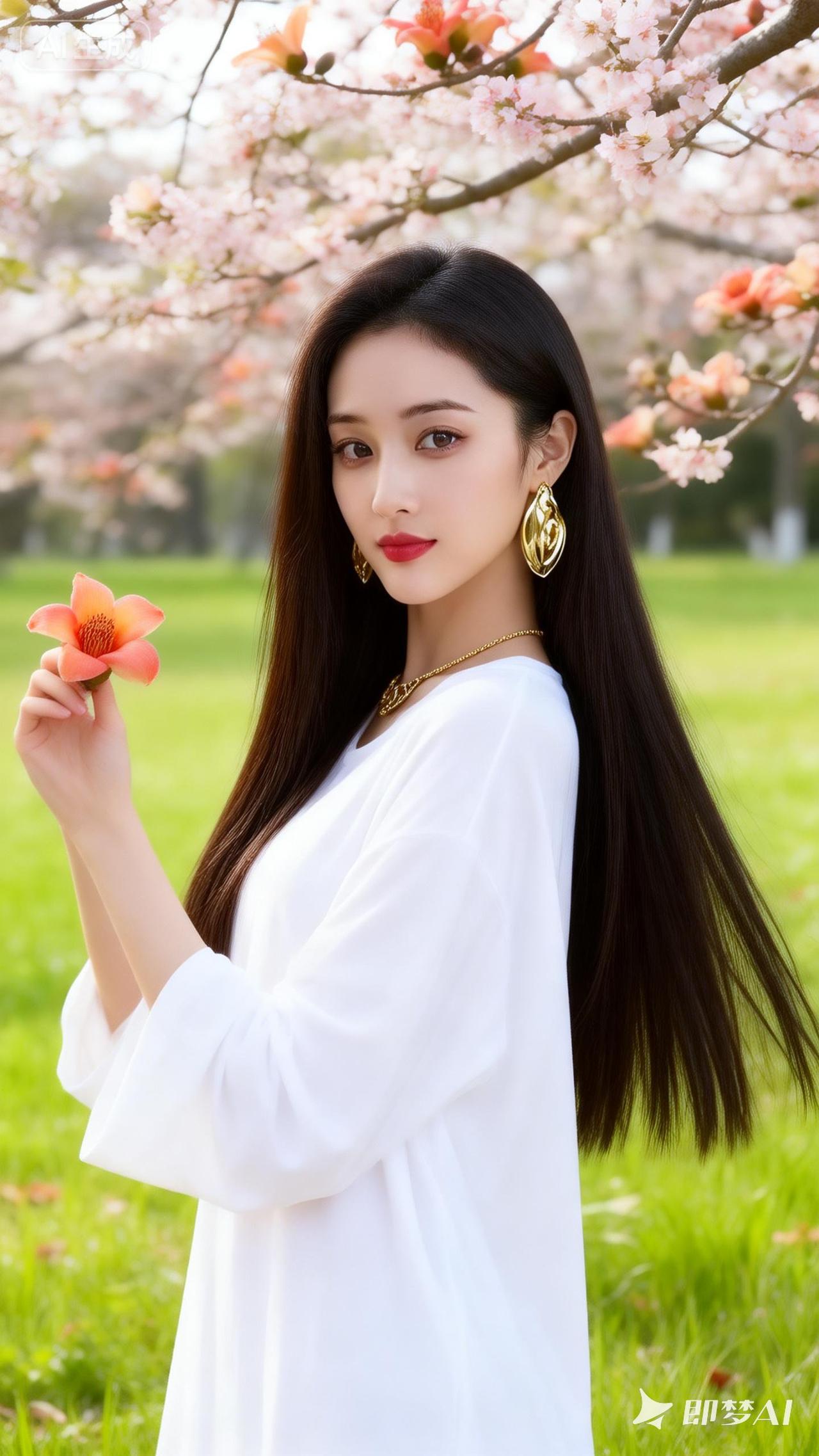 樱花树下,温柔少女手捧花束,春日气息扑面而来。