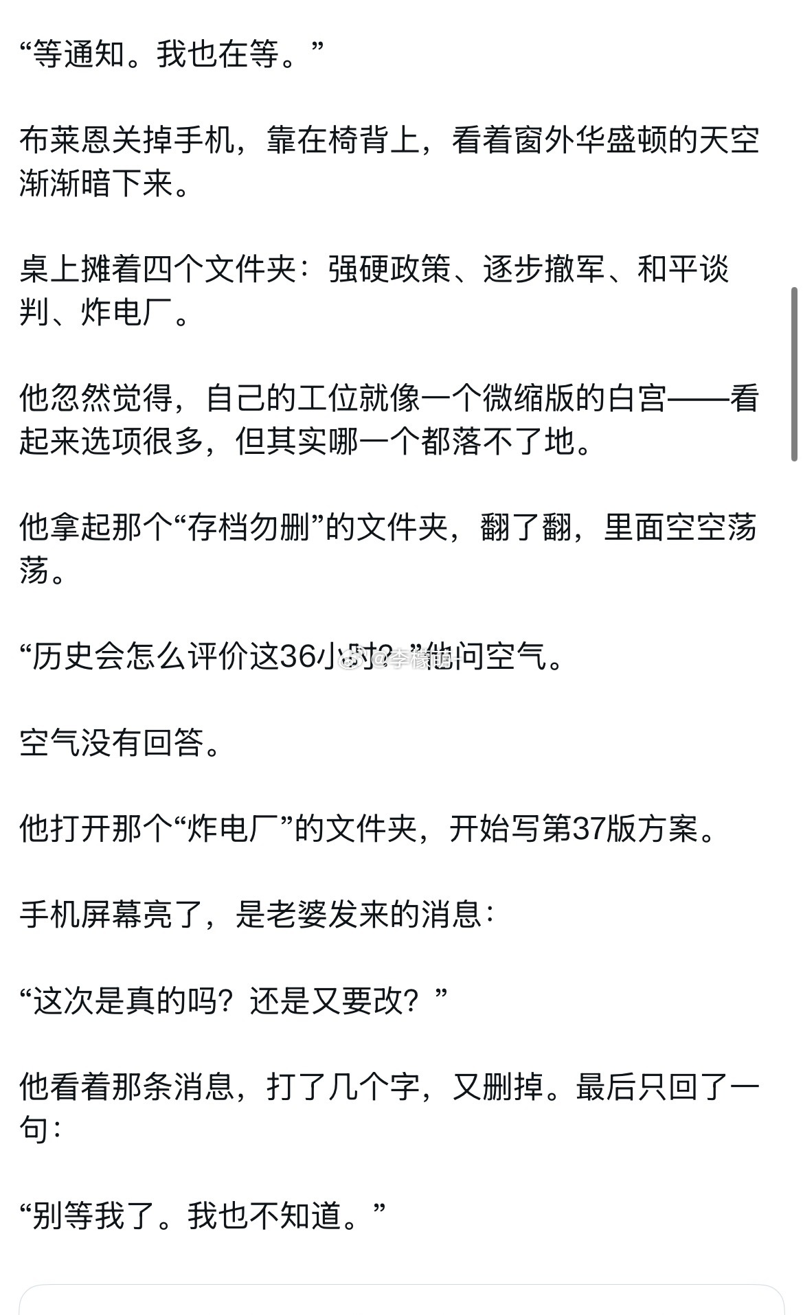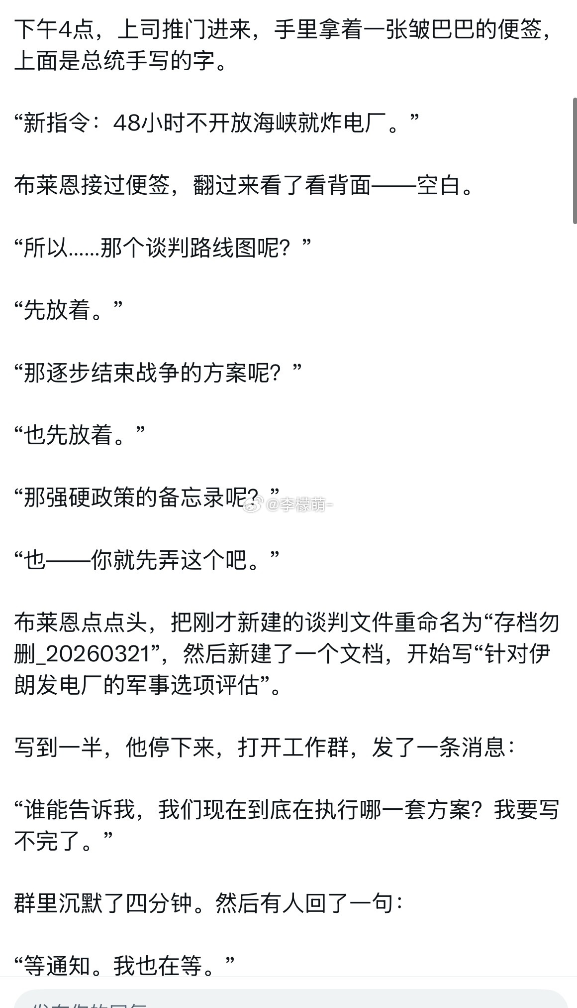 川宝过去36小时的讲话:美国东部时间周五下午 3:40:“我不想与伊朗停火。”美国东部时间周五下午 5:15:美国正在“考虑逐步结束”与伊朗的战争。下午 2 点(美国东部时间):Axios 报道称,特朗普正计划举行“和平谈判”。现在:“如果伊朗在48小时内不开放霍尔木兹海峡,美国将摧毁伊朗的发电厂。”