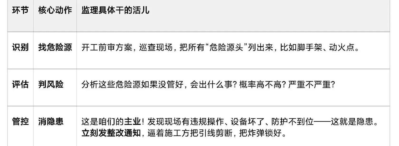 工地每天死磕危险源、风险、隐患这仨词,很多人却分不清到底谁是谁,结果管安全管成糊涂账。 2024年全国房屋市政工程高处坠落事故占总数的近60%,物体打击紧随其后,建材行业机械伤害+高处坠落+物体打击就占了86%的事故死亡人数(应急管理部数据)。 这些血的教训背后,其实就藏着三个词的铁逻辑链:从潜在炸弹,到炸不炸的概率,再到炸弹已经拆了保险。 危险源就是那个客观存在的“能量炸弹”本身。塔吊、深基坑、带电线路、高空作业面,这些东西天生就携带着巨大能量或危险状态。只要现场有它们,伤害的可能性就始终潜伏着,不会因为没人碰就消失。它是源头,管安全先得把所有这些源头摸清底数。 风险则是这颗炸弹“炸不炸、炸多狠”的量化评估。拿高空坠落举例:危险源是20层楼体本身,风险就是工人不戴帽从楼下过,被掉砖砸中的概率高不高、后果是不是直接致命。住建部2024版重大事故隐患判定标准里,高处作业防护缺失直接列为重大隐患,正是因为这类风险值一旦失控,后果太严重。 隐患才是真正把炸弹引线点燃的那个失控状态。危险源一直都在,但人为违规让它失控了才叫隐患。比如塔吊限位器坏了没修、工人高空不系安全带、临边没防护网还让人干活,这些就是物的不安全状态+人的不安全行为+管理的缺失。隐患不是潜在,而是已经出现的违规现实,必须立刻停工整改,否则直接转化成事故。 监理一线最狠的活,就是把这三者闭环跑通:先全面识别危险源,再科学评估出高风险点,最后盯死所有隐患不放过。高处坠落和物体打击连续多年稳居建筑死亡前二,根子就在隐患没及时消灭,风险没控住。 ,危险源是静态雷,风险是可能爆炸的计算,隐患是已经拉环的现实。管好了隐患,高风险就降下来;控住了风险,事故才能真正远去