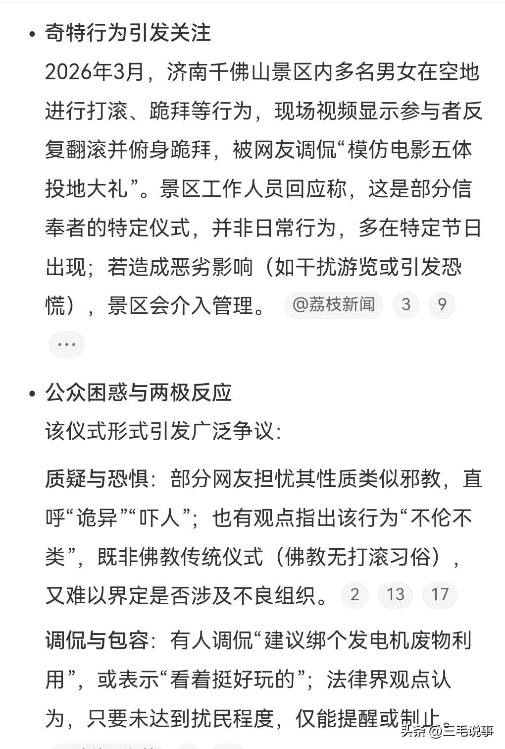 有些人的行为实在是太愚蠢了。竟然在空地上打滚跪拜,真是多么的可笑。一看这些人这个认知就不是很好,认知好的不会做出这种愚蠢而离谱的事情。是在一景区做出了这样的行为。景区也回应了这个情况,景区说这是他们的一种仪式,特定的节日就会来,如果太过分会选择制止。 这样的行为确实太诡异了,不符合一般人的行为,绝大多数的人都不会做出这种离谱的事情。 法律界的观点认为,只要没有打扰到别人,对这种行为最多只能进行提醒或者是制止。 不过也有观点认为这样的行为可能会导致儿童受到惊吓。 这些人是一点都不嫌地上脏,在地上滚来滚去的,好好的衣服都被弄脏了,这真的是不知道该说什么好了。希望这样奇葩的人越少越好,最好是没有。当然这也是他们的自由,别人也管不着。