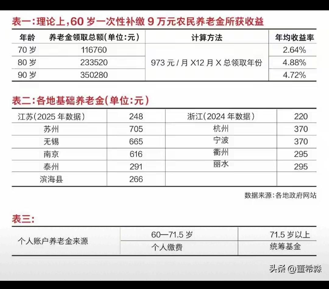 别再盯着补缴9万回本!农民养老金收紧,藏着比理财更重要的真相 谁还在把农民养老金补缴当“稳赚理财”?补缴9万月领近千,8年回本的账看着香,可海南、佛山、宝鸡等地纷纷叫停,2026年起60岁后不能直接一次性补,得先逐年交到65岁,补缴还没补贴。这哪是福利收紧,分明是社保在算“长远账”! 很多人盯着短期回本,却忽略两个关键:一是地区差距,上海基础养老金1555元,云南才200元,有人钻空子迁户口套利,破坏公平;二是基金压力,领养老金的人超1.7亿,缴费人数却在减,高补缴持续会拖垮制度可持续。更扎心的是,只惠及能拿出9万的家庭,80%选最低档的低收入老人反而被落下,这就违背了普惠初心。 社保不是理财产品,核心是让人人老有所养。政策收紧不是为难人,是逼着大家早规划、长缴费,守住制度公平和长远底气。你家老人符合补缴条件吗?觉得该怎么平衡缴费和保障?城乡养老政策 农民农保权益