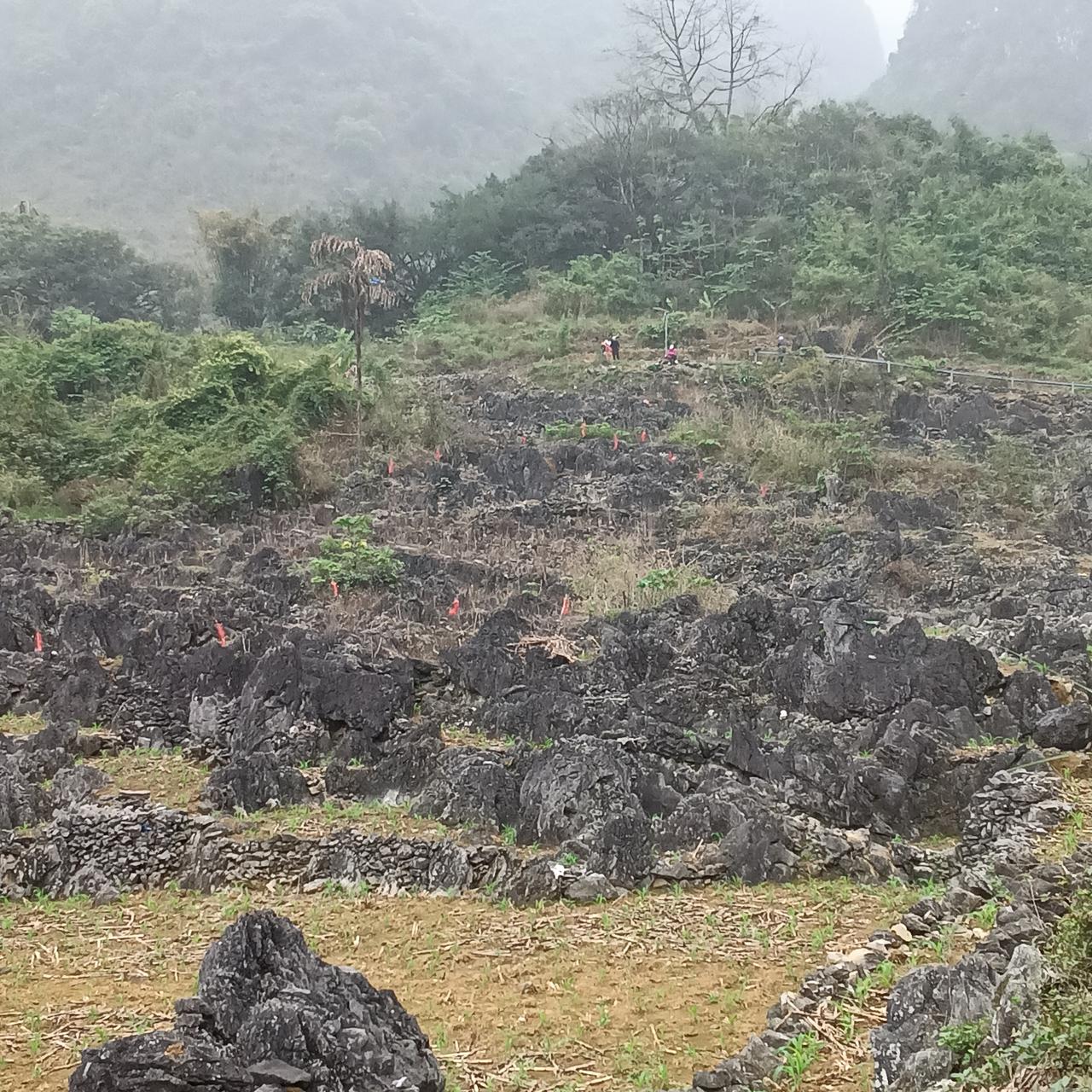 巴马的山各有特点 黑石与喀斯特主导 今天上的这座小山,位置在巴马坡月村足拉屯后身,盘阳河的北面。 走到山腰便能欣赏到黑色的石头,错落有致一层层排列,呈阶梯状构成一幅自然的画卷。 在石缝中,康养人和当地居民并没有放弃对它的管护, Ok,有的插上小彩旗,有的种植一些玉米等粮食蔬菜。 美丽的风景靠人来呵护,优质的环境更需要每个人用心打造和爱护。 愿你巴马的每一寸土地、每一滴水都能得到最好的关爱。