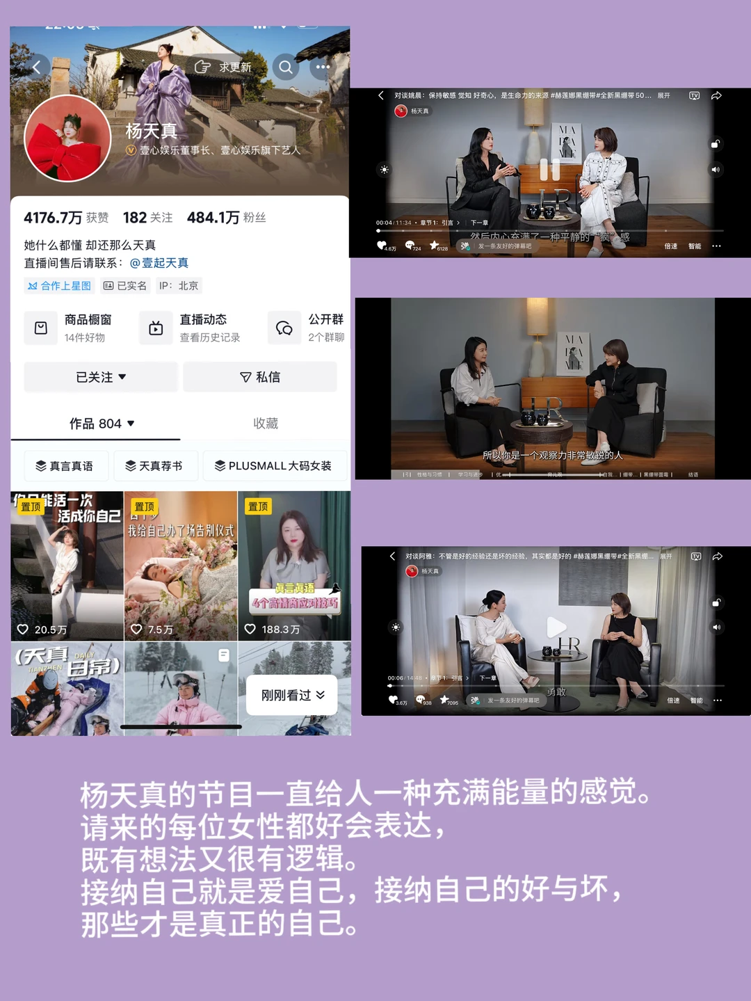 杨天真的节目一直给人一种充满能量的感觉。请来的每位女性都好会表达,既有想法又很有逻辑。接纳自己就是爱自己,接纳自己的好与坏,那些才是真正的自己。