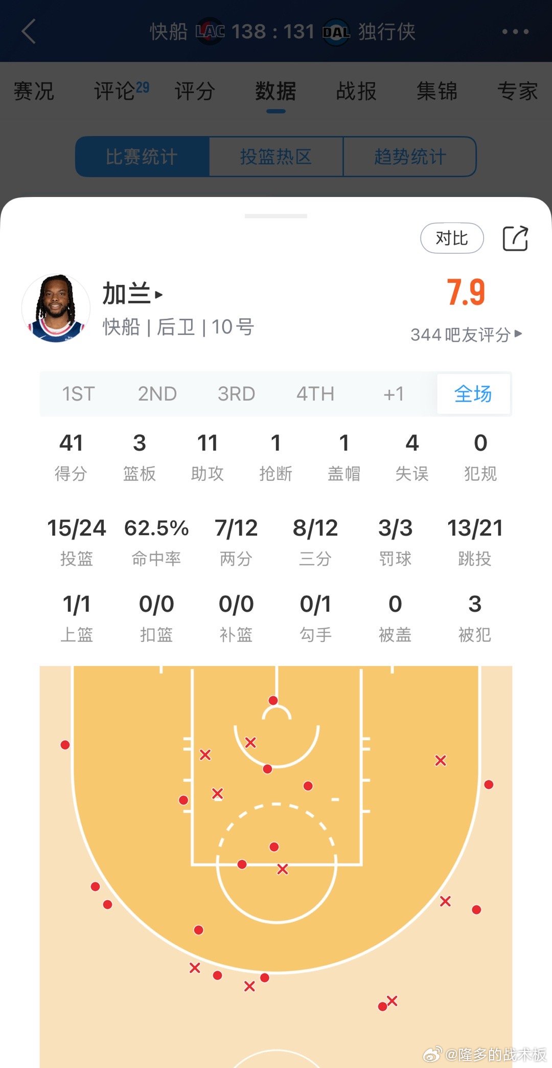 加兰狂轰41分11助,24中15,三分12中8快船vs独行侠