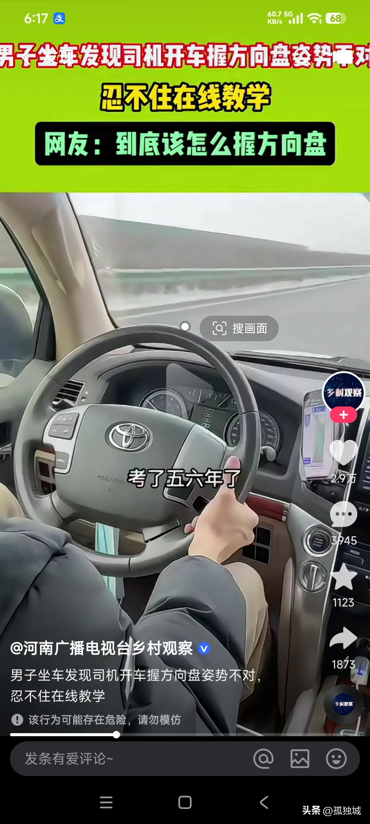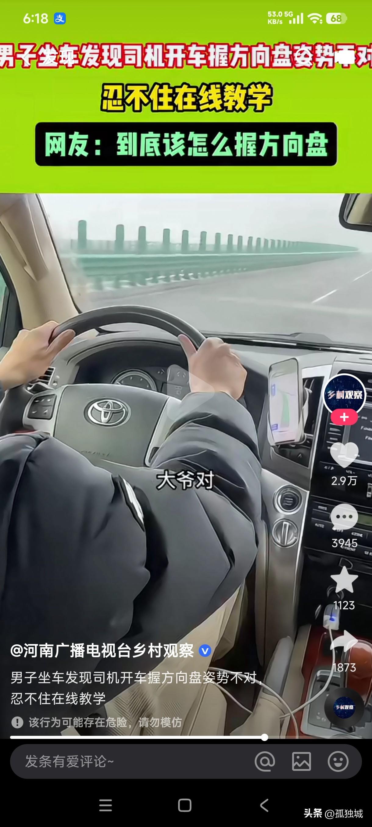 大爷坐车发现司机开车握方向盘的姿势不对,立马问小伙驾照是考的还是买的,小伙说驾照考了五六年了,大爷说教练当初就是这么教你握方向盘的吗?这不是拿生命在开玩笑吗,你那种握法遇到突发情况这不是害人害己吗?自己作为司机连自己的安全都保障不了,还如何保证车上其他人的安全,大爷立即给小伙当场教学如何握方向盘,小伙听大爷这样说的也在理,当场就改正过来握方向盘的姿势。 不得不说这世上的好心人还是随处可见,大爷坐车就发现了司机握方向盘的姿势,于是立马提意见让司机改正,司机也是虚心接受大爷的意见,老司机终究还是老司机,姜还是老的辣这句话到任何时候都不会过期是不是?