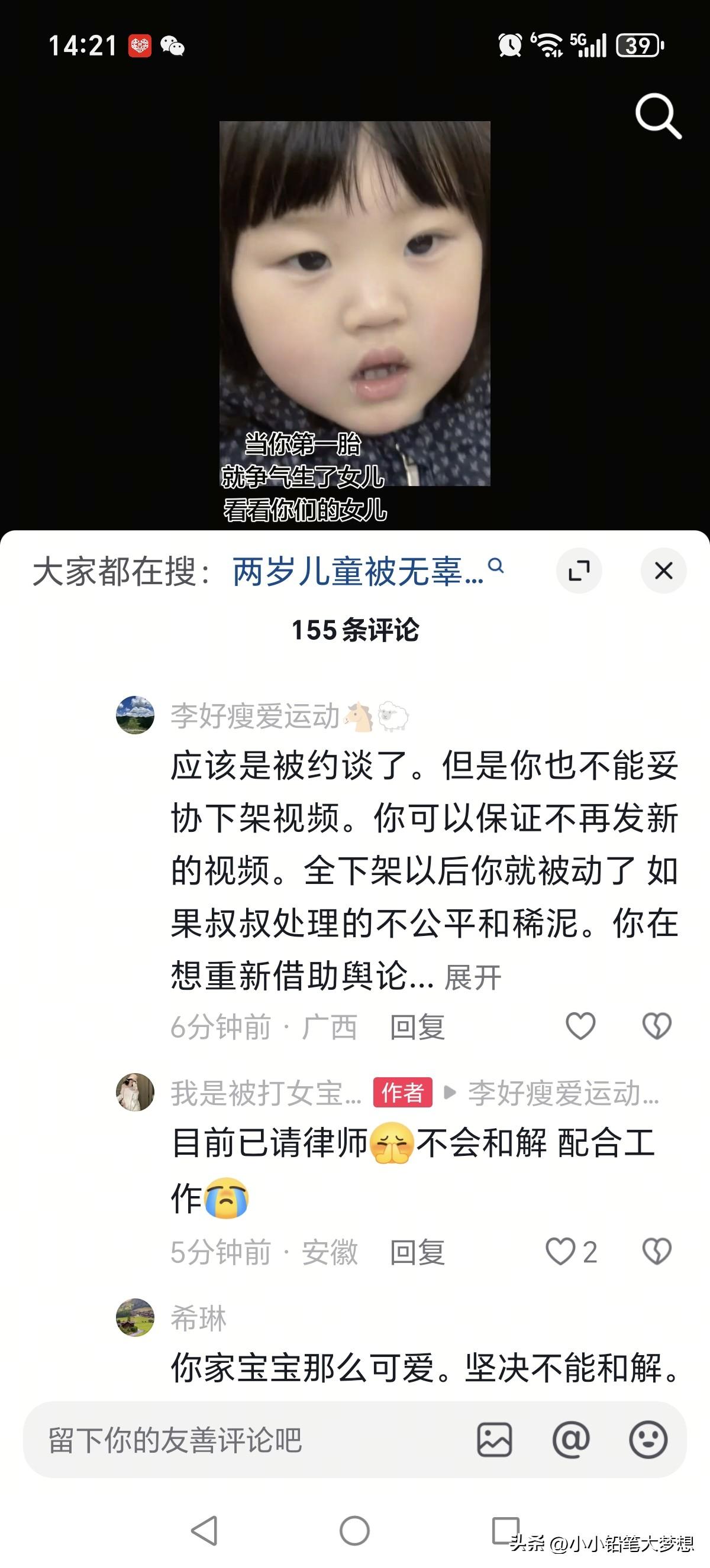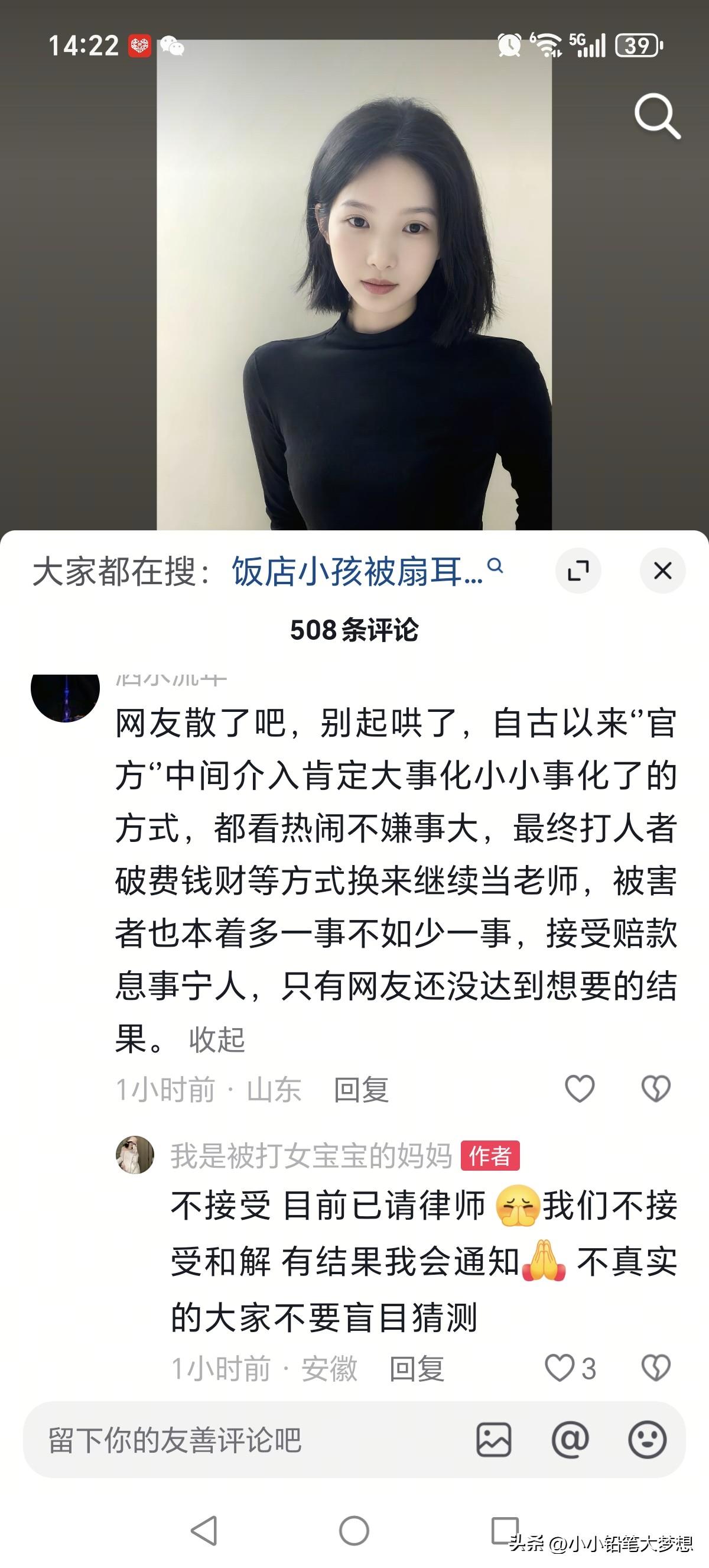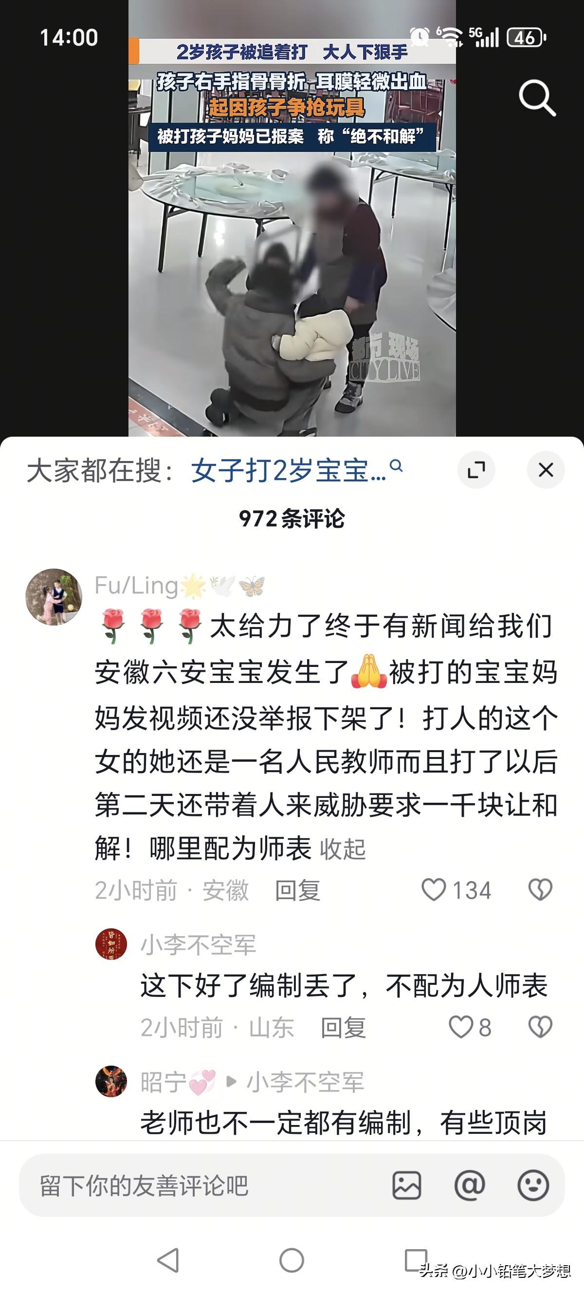 太过分了!安徽一2岁宝宝被一个成年人追着打,致孩子手指骨折,耳膜出血,脸部多处损伤,打人者的身份居然还是一名教师! 3月19日,安徽六安一家餐馆内,两名小童因为争抢一辆小车发生了小矛盾,一名黑色衣服的小童因此抓了一下白色衣服的小童,白衣小童哭闹,白衣小童的妈妈之后立刻抱着孩子上前追着黑衣小童愤怒实施报复。 从视频中我们可以这看到这名女子打人的力度非常大,而且打人的时候一直在叫喊:“打,打,打!” 黑色衣服的小孩随后吓惊大哭。而旁边的服务员不知道是因为害怕得罪客人,还是什么原因,居然没有主动上前阻止和保护孩子。 这个视频看的让人气愤啊!小孩之间争吵玩具,这是一件非常小的事情但白衣小童的妈妈看到自己家孩子哭了,没有上前沟通,也没有任何的警告,直接上手暴力殴打幼童,这下手是又快又狠,还特意打向孩子的脸部,耳部在最重要位置,这真的是太过分! 被打孩子的母亲发声,孩子右手手指骨折,耳膜出血,脸部,肩部有多处损伤。而且这个孩子是她好不容易保胎生下来了,自己都没舍得打一下,却被那个宝妈打的这么狠,而且连一个道歉都没有! 这件事情最离谱的是黑衣小童是饭店老板女儿,白衣小童是来吃饭的顾客,那辆小车本来就是黑衣小童的车车,白衣小童想骑黑衣小童的小车,黑衣小童只是正常护着自己的车,明明是自己家孩子没有经过允许争抢了人家的车,这位妈妈不上前教育自己家孩子抢人家玩具是不对,反而把人家孩子中指硬性掰断,并追着扇好几巴掌。 孩子之间的小摩擦,大人怎么可以用实施如此暴力的行为?这真是缺大德了,对一个两岁的幼童这么狠心,这是侵害未成年人法呀,作为一个老师不知道自己已经违法了吗? 黑衣幼童孩子的妈妈表示,事后这位白衣妈妈想要拿1000块钱来解决问题,但是她坚决不同意,所以报了警,现在这个白衣幼童的妈妈已经被拘了,而且黑幼童的妈妈直接表示会直接请律师,并坚决不会和解! 确实应该走法律途径,她自己也是有孩子的人,而且自己的孩子也跟店家的孩子差不了多少,但凡有一点善良的心和有一点理智,都干不出这样丧心病狂的事情,更何况还是一名人民教师,难以想象她是怎么教孩子的,一句话,成年人为自己的冲动买单吧!为自己的失控和恶毒付出代价吧! 孩子之间的小矛盾,应该由孩子家长正确理性引导两个孩子之间自行化解而不是由家长出面暴力解决。