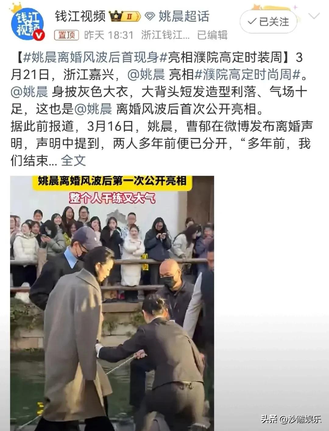 姚晨,最新高调亮相! 3月22日,姚晨突然冲上热搜高位,距离她和曹郁官宣离婚才过去短短6天。本以为会看到一位情绪低落、暂避风头的女明星,没想到姚晨直接杀到了浙江嘉兴濮院高定时尚周,用一身飒到极致的造型告诉所有人——姐好着呢! 3月16日,姚晨和曹郁联合发布离婚声明,坦言“多年前已结束婚姻关系,因孩子年幼未公开”。消息一出,舆论哗然。没有撕扯、没有爆料,只有一句体面的交代,干净利落。 而就在昨天,姚晨现身濮院时尚周,这是她离婚风波后的首次公开亮相。当天她身披灰色长款大衣,梳着大背头短发,整个人利落得像一把出鞘的刀。在人群簇拥下,她从容走过水乡小桥,随后换上黑色亮片上衣配丝绒阔腿裤的黑色高定套装,双手插兜站在秀场前摆拍,女王气场直接拉满。 姚晨这次的亮相,最大的亮点不是造型本身,而是她身上那股“完全没被影响”的松弛感。 要知道,娱乐圈不少明星官宣离婚后,要么沉寂一段时间避风头,要么被拍到状态憔悴、强颜欢笑。但姚晨倒好,该工作工作,该亮相亮相,面对镜头没有半点闪躲,反而比以往多了几分笃定和从容。 有网友精准点评:“这不是强撑,这是真·内核稳。”还有人说:“苏明玉本玉,戏里戏外都是大女主。” 说实话,姚晨这一波操作,堪称离婚公关的教科书级范本。 她没有卖惨、没有炒作、没有含沙射影,甚至连一条意味深长的动态都没发。官宣时干净利落,亮相时大大方方。这种“不解释、不纠缠、不回头”的姿态,比任何小作文都有力量。 6天时间,从官宣到复工,她用行动告诉所有人:婚姻只是人生的一部分,不是全部。一个女人的底气,从来不是来自婚姻的存续,而是来自她能不能在任何情况下都稳稳地接住自己。 从《武林外传》的郭芙蓉到《都挺好》的苏明玉,再到如今现实中的姚晨,她一路走来,始终在诠释什么叫“拎得清”。这次时尚周的亮相,更像是一份给外界的成绩单——即便经历婚姻变动,她依旧能在自己的领域里发光发热。 这样的姚晨,值得一句:姐姐,继续搞事业吧,我们都挺你!