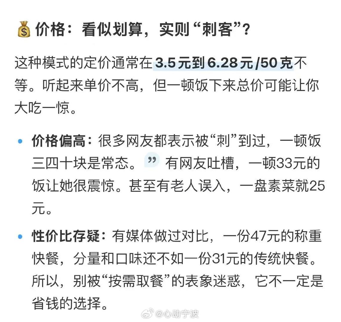宁波称重快餐太卷了网友直呼被背刺 近年宁波自助称重快餐店越开越多,从早期稻状元,到亿家旺、新四方等纷纷跟进,消费者从新鲜逐渐感到视觉疲劳。该模式虽菜品丰富、减少浪费,但不少网友吐槽性价比低、易成价格刺客,担心被“背刺”,对大胃人群尤其不友好,远不如传统打餐实在。大家最关心的仍是价格透明与划算度,而非一味跟风新模式。(东方热线)