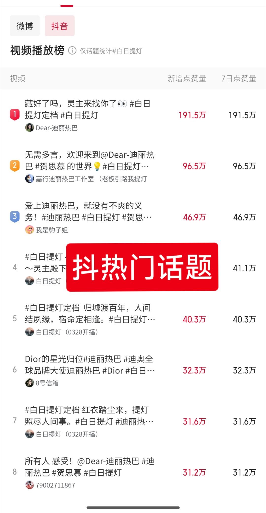迪丽热巴贺思慕五感皆空曝迪丽热巴团队重整《白日提灯》演员抖,微博热度一览,这怎么不算热巴扛剧呢?