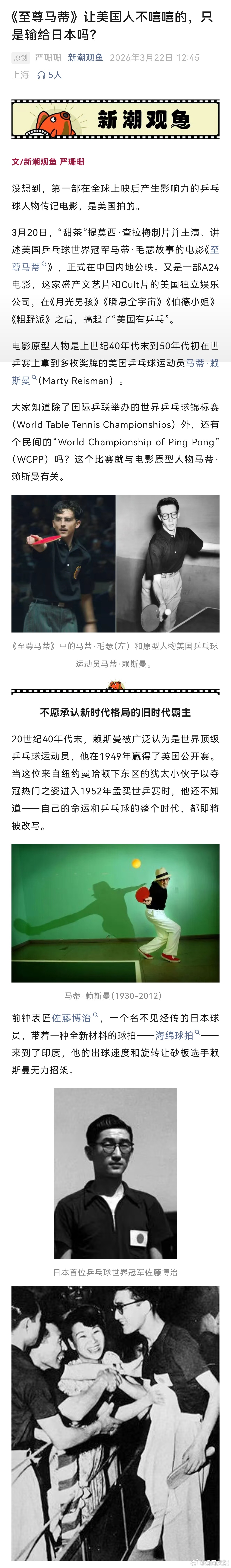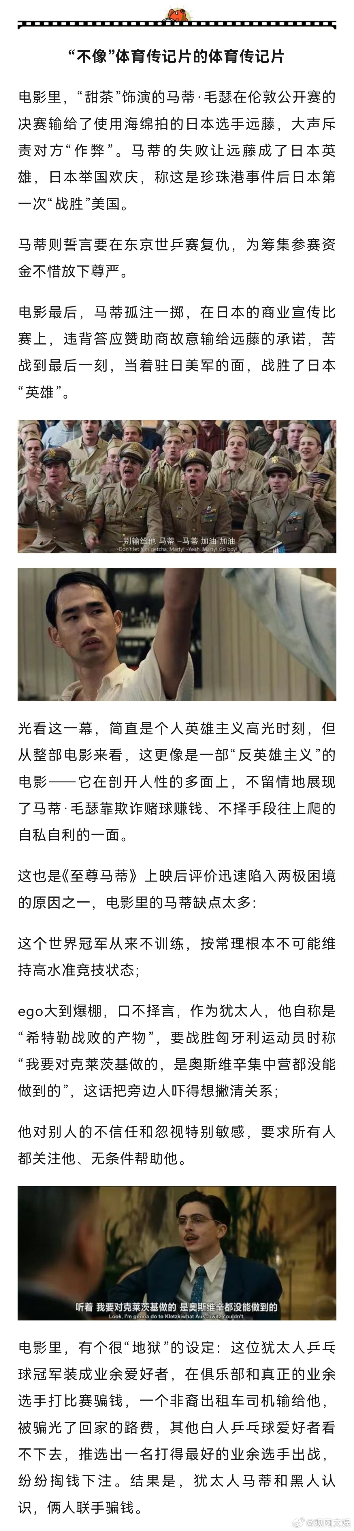 【《至尊马蒂》让美国人不嘻嘻的,只是输给日本吗?】至尊马蒂里美国只是忌惮海绵球拍吗3月20日,“甜茶”提莫西·查拉梅制片并主演、讲述美国乒乓球世界冠军马蒂·毛瑟故事的电影《至尊马蒂》,正式在中国内地公映。