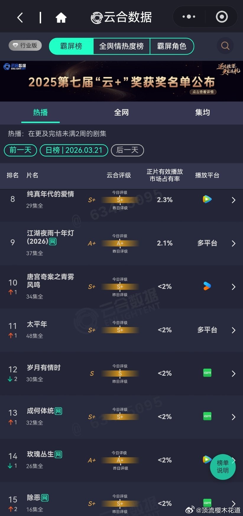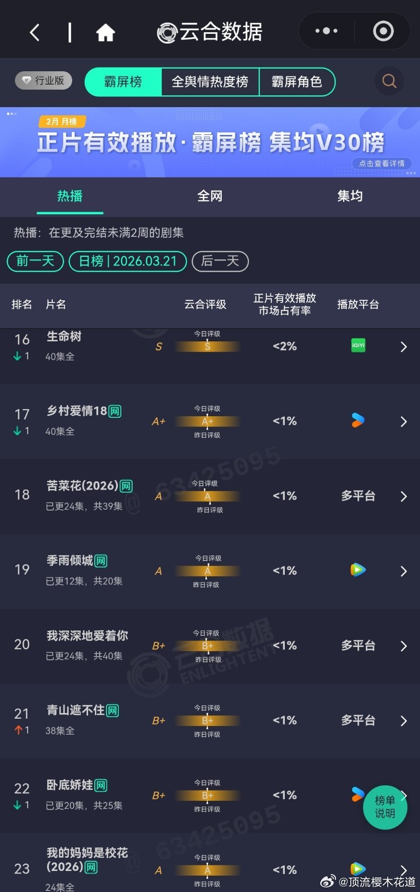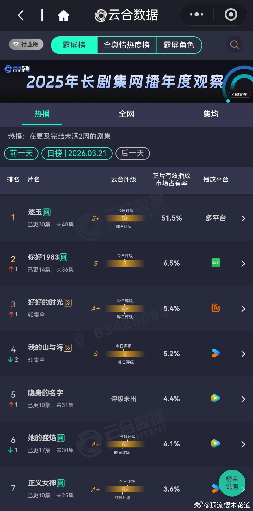3月21日云合播放占比云合 酷云逐玉云合51.5%,酷云48.93%你好1983 云合6.5% 酷云6.98%评级S