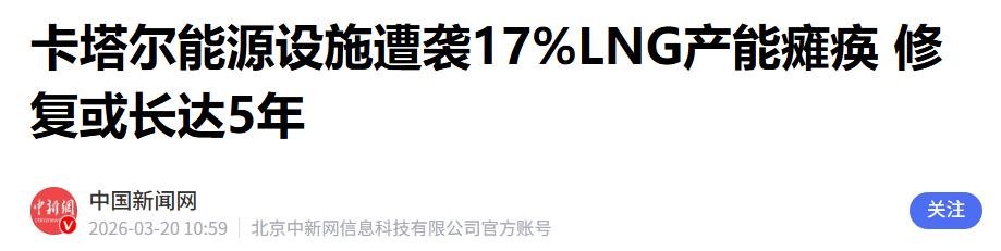 中方拒绝派军舰护航后,美疑似借卡塔尔之手敲打北京,宣布对华天然气断供!3月19日,卡塔尔能源大臣萨阿德·卡阿比公开声明,位于拉斯拉凡工业城的关键能源设施遭遇严重破坏:14条液化天然气生产线中有2条被炸毁,同时一座关键的气转液(GTL)设施也受损严重。 卡塔尔是全球数一数二的液化天然气出口国,占据全球约20%的供应份额,而拉斯拉凡工业城,就是全球最大的液化天然气生产综合体之一,咱们中国很多天然气,都是从卡塔尔进口的。 根据官方数据,卡塔尔是中国第二大液化天然气进口来源国,2024年一年,咱们就从卡塔尔进口了1834.6万吨液化天然气,不管是工业生产,还是咱们老百姓冬天供暖、日常做饭,都离不开这些天然气。 设施被炸之后,卡塔尔方面很快就表态,受损的设施修复起来非常麻烦,需要3到5年的时间,而且每年会损失约200亿美元的收入。 紧接着,3月21日,卡塔尔能源公司正式宣布,对中国、韩国、比利时、意大利四个国家,启动液化天然气长期供应合同的不可抗力条款,这就意味着,接下来最长5年时间,卡塔尔没法按照之前的合同,给咱们中国供天然气了,相当于直接宣布了对华天然气断供。 这事看着像是偶然发生的,毕竟是能源设施被袭击导致的,但结合之前中方拒绝美国护航的事,就不得不让人怀疑,这里面有美国的影子,大概率是美国借卡塔尔之手,来敲打咱们中国。 为什么这么说呢?因为美国和卡塔尔的能源合作非常密切,早在2022年,美国康菲石油公司就参与了卡塔尔北部海上天然气田的扩建项目,获得了项目的部分权益。 而且还有美国能源巨头埃克森美孚,是卡塔尔能源多个项目的关键合资伙伴,直接参与拉斯拉凡设施的液化和出口运营,美国对卡塔尔的能源领域,有着很大的影响力。 再说说袭击的来龙去脉,根源是以色列袭击了伊朗的气田,伊朗为了报复,就袭击了和美国利益相关的能源设施,而卡塔尔因为和美国走得近,就成了报复目标。 但这里面有个疑点,美媒报道称,特朗普在以色列行动之前就知道,还表示支持,可他事后又发文说自己毫不知情,这种前后矛盾的说法,更让人觉得不对劲。 说白了,美国很可能就是想借中东局势的混乱,让卡塔尔的能源设施受损,进而让卡塔尔没法给中国供天然气,以此来施压中国,报复咱们之前拒绝派军舰护航的事。 可能有人会担心,卡塔尔断供天然气,咱们中国会不会缺气?其实大家不用太担心。虽然卡塔尔是咱们的第二大进口来源国,但咱们早就有了多元化的进口渠道,比如从俄罗斯、澳大利亚等国家也能进口天然气,而且咱们国内也在加快发展新能源,提升本土储气能力,短期可能会有一点供应缺口,但绝对不会被卡脖子,更不会因为美国的这点小伎俩就慌了神。 咱们中国做事,一向有自己的原则和底线,不会因为美国的威胁就妥协,也不会被美国的小动作牵着鼻子走。 之前拒绝派军舰护航,是为了维护地区和平稳定,是站在国际社会共同利益的角度考虑;现在面对卡塔尔的天然气断供,咱们也有足够的应对能力,从容不迫。 这事也能看出来,美国一贯的作风就是这样,只要别的国家不顺着他的意思来,他就会想各种办法施压、报复,哪怕是借第三方的手,也在所不惜。 但现在的中国,早就不是以前那个任人拿捏的样子了,咱们有足够的实力保障自己的利益,不管是能源安全,还是国家主权,都不会被任何国家轻易挑衅。 而且卡塔尔的断供,对他们自己也没好处,每年要损失200亿美元,还得罪了中国这个最大的贸易伙伴,得不偿失。 反观咱们中国,虽然短期会受点影响,但这也更让咱们意识到,能源多元化的重要性,以后咱们会进一步加强和其他国家的能源合作,提升自身的能源保障能力,让美国的任何敲打和施压,都起不到任何作用。 总的来说,从中方拒绝美国护航要求,到卡塔尔能源设施被炸,再到对华天然气断供,这一系列的事情,看似偶然,实则有着明显的关联。 美国疑似借卡塔尔之手敲打中国,试图逼咱们妥协,但他们显然打错了算盘。中国的态度始终坚定,不会被任何外部压力所动摇,咱们有能力、有底气,保障自己的国家利益和能源安全,不管美国耍什么花招,都没用。