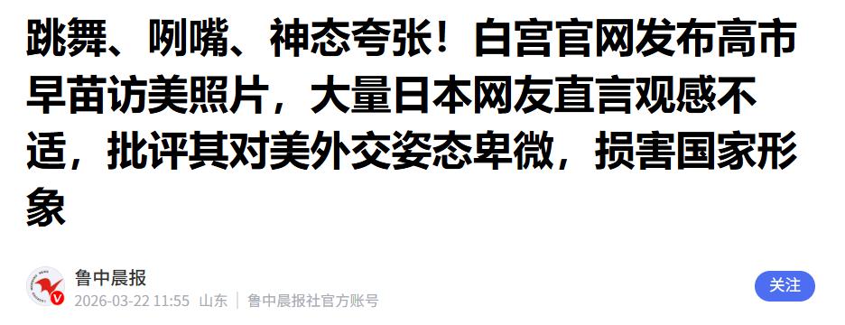 把她的丑照挂在白宫官网上示众,特朗普这么回应高市早苗的? 高市早苗卖力讨好特朗普,结果白宫扭头她的丑照挂在网站上? 3月19号,高市早苗专程去美国白宫见特朗普,为了讨好特朗普,她可真是下足了功夫,做的每一件事都透着刻意。 一开始,特朗普开场欢迎她之后,她特意装模作样地用英文发言,结果说得磕磕巴巴、断断续续,连话都说不连贯,最后还是特朗普提醒她“有翻译”,她才尴尬地改回日语发言,闹了个不小的笑话。 不光如此,她还特意拉近关系,不叫特朗普“总统”,反而直接叫他的名字“唐纳德”,还当着所有人的面吹捧特朗普,说现在中东和全球的安全形势都很严峻,世界经济也受了很大影响,而“只有唐纳德能给世界带来和平与繁荣”。 这番话一出口,日本国内就炸了锅,不少网友直言,这也太谄媚了,简直令人羞耻。 为了进一步讨好特朗普,高市早苗还拿出了真金白银的“大礼”——宣布给美国投资730亿美元,用来在美国建核电站和天然气设施,而且这笔投资的收益分配特别不合理,日本回本之前,中美双方各分一半,回本之后,美国分九成,日本只分一成,相当于日本出钱出力,却只能赚点零头。 除此之外,她在晚宴上还特意给特朗普的儿子巴伦送生日祝福,夸巴伦长得高挑英俊,说他优秀的基因一眼就能看出来,哄得特朗普得意地笑了起来,还拍了拍她表示满意。 高市早苗这么卖力讨好,本来是想换特朗普的重视和支持,可她万万没想到,转头就被特朗普政府狠狠羞辱了一番。 3月20号,白宫在官网上放出了一组高市早苗访美会晤的照片,这些照片根本没有一点两国领导人会晤的庄重样子,全是专门抓拍高市早苗各种夸张、谄媚的特写。 其中最显眼的一张,高市早苗张大嘴巴,还举起双臂,看起来就像是在白宫里激动地大吼大叫,一点没有国家首相的样子;还有几张,要么是她笑容夸张到变形,要么是跟特朗普交谈时,身体前倾、双手抱在胸前,一副刻意讨好的模样,甚至还有她在晚宴上跟着乐队即兴跳舞的照片,姿态随意,仪态尽失。 这些照片被挂在白宫官网上,明摆着就是故意丑化她,把她当成笑柄示众。这件事很快传到了日本,日本网友彻底炸锅了,就连平时一直吹捧高市早苗“有强领导力”、不管什么事都喊她“赢赢赢”的日本右翼网友,也绷不住了,纷纷吐槽说,这根本就是美国对高市早苗本人,甚至对整个日本的羞辱和嘲笑,特朗普政府根本没把高市早苗放在眼里,只是把她当成了可供取乐的小丑。 大家都在等着特朗普出来回应这件事,可特朗普从头到尾都没正面提过挂丑照的事,既没说这是失误,也没道歉,他的态度本身,就是最伤人的回应——默许白宫挂出这些丑照,就是不把高市早苗的尊严放在眼里,也不把日本放在眼里。 其实,特朗普对高市早苗的轻视,早就不是第一次了。就在两人会谈的时候,有记者问特朗普,为什么美国袭击伊朗之前,不提前通知日本等盟友,特朗普竟然拿日本偷袭珍珠港的事开玩笑,说“我们想要出其不意,还有谁比日本更懂得出其不意呢?你为什么不跟我说说珍珠港?”说完之后,现场还响起了笑声,而高市早苗只能尴尬地坐在椅子上,睁大双眼,勉强挤出微笑,一句话都不敢说。 要知道,珍珠港事件是美国的国耻,当年日本偷袭珍珠港,导致美国两千四百多人死亡,美国人事到如今都铭记在心,以往的美国总统,面对日本领导人时,都会刻意避开这个话题,可特朗普却当着高市早苗的面,拿这件事揭短、羞辱她,就是想故意让她难堪,彰显自己的傲慢。 高市早苗费尽心机,又是吹捧又是送钱,拼尽全力讨好特朗普,可特朗普不仅不领情,还默许白宫挂她的丑照示众,当面拿国耻羞辱她,这份轻视和羞辱,不光打了高市早苗的脸,也让整个日本都跟着丢人。 日本外务省的人都私下叹息,说这次高市早苗访美,选在了最糟糕的时机,误算接连发生,最后落得个自取其辱的下场。 现在,日本国内反对高市早苗的声音越来越大,不少人批评她的“谄媚外交”,说她为了讨好美国,不惜牺牲日本的利益,拿出民众的血汗钱给美国投资,最后却换来了羞辱,损害了日本的国家形象。还有日本前官员直言,高市早苗一味依附美国、献媚美国,走的是一条完全错误的路。 说到底,高市早苗的遭遇,其实就是美国对日本态度的真实写照——美国从来没有把日本当成平等的盟友,只是把它当成自己的附庸,需要的时候就哄一哄,不需要的时候,就可以随意羞辱、拿捏。 高市早苗以为靠讨好和送钱就能换来支持,到头来却只是一场笑话,而特朗普的沉默和默许,就是对她最冷漠、最伤人的回应,也让所有人都看清楚了,靠谄媚换不来尊重,只有自身强大,才能被人正视。