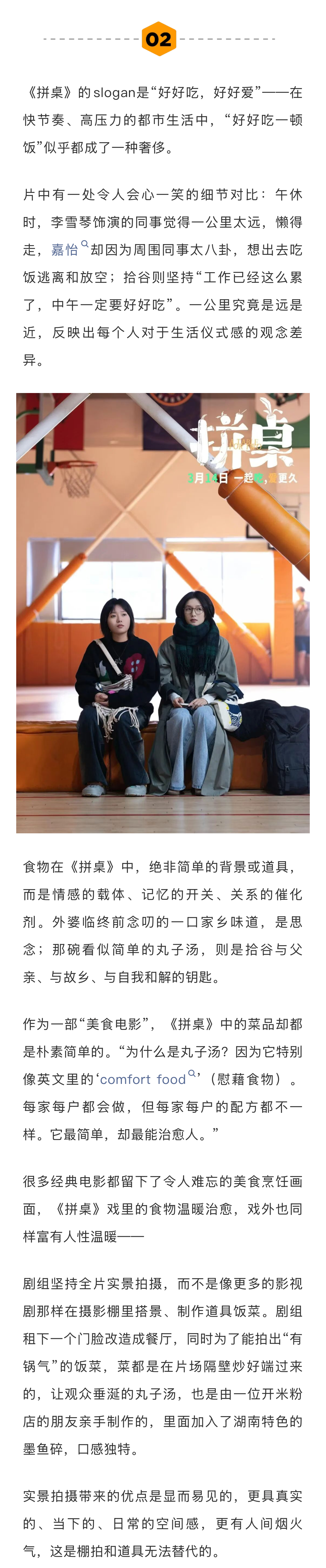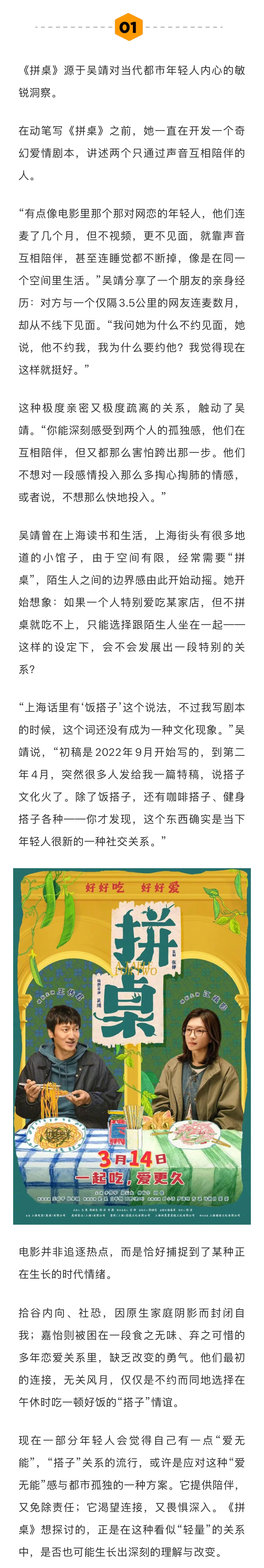 导演说江疏影是被美貌耽误的好演员王传君给老同学江疏影介绍新戏 作为首执导筒的新导演,吴靖的压力不言而喻。丰富的从业经历让她能多角度看待问题,“但缺点就是容易想太多,可能不如刚从学校出来的青年导演那么‘冲’。”和新浪娱乐工作室对话时,她表示“成长”才是《拼桌》这个故事的最重要的主线。谈及影片的开放式结局,她也表示影片中的主角可有开始爱情了。在导演看来,选择王传君和江疏影,也是电影成功的关键一步。其中王传君是看过剧本后主动想演拾谷这个角色的,而江疏影则是王传君推荐的…娱理独家↓