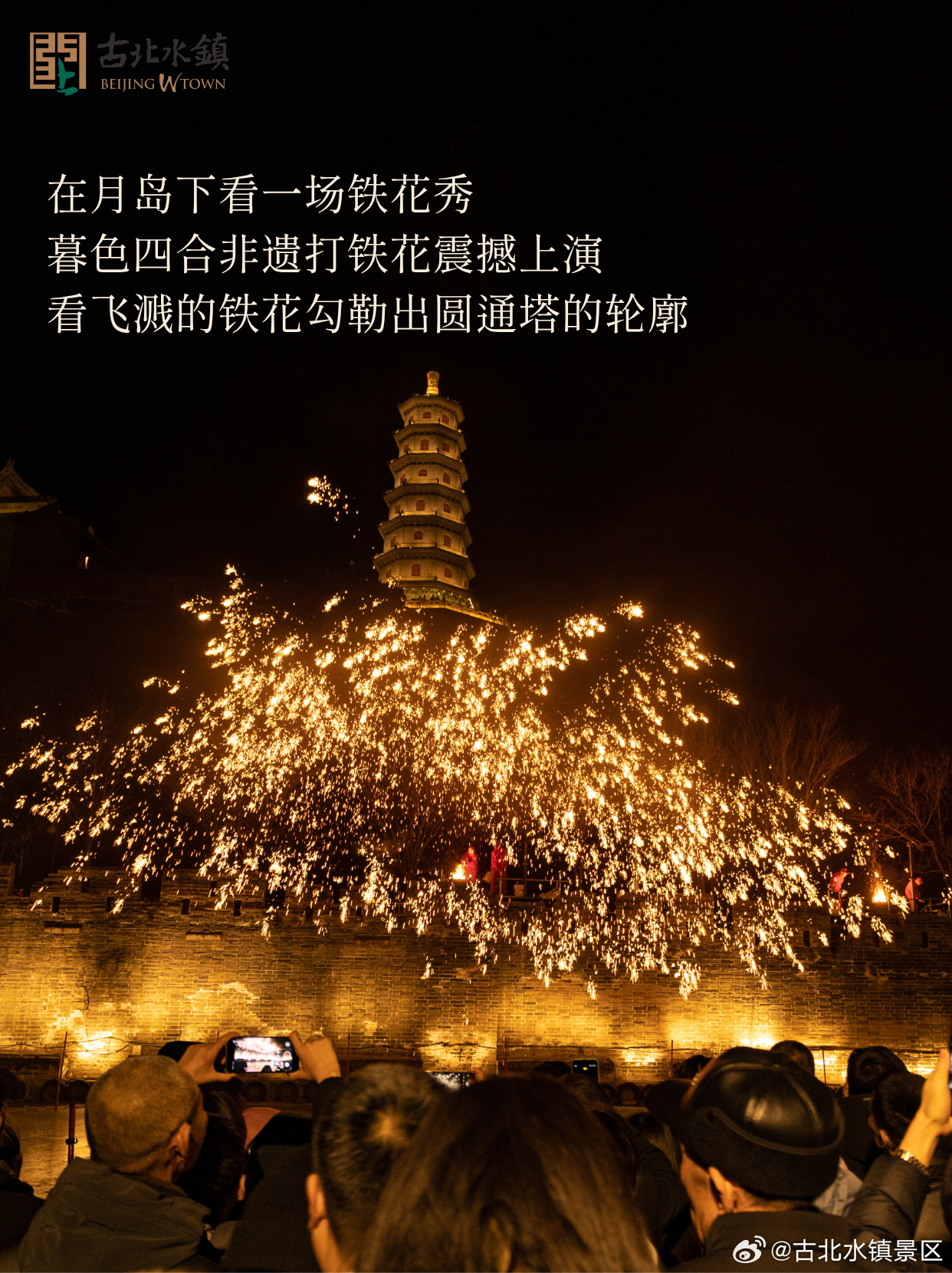 在月岛下看一场铁花秀暮色四合非遗打铁花震撼上演看飞溅的铁花勾勒出圆通塔的轮廓