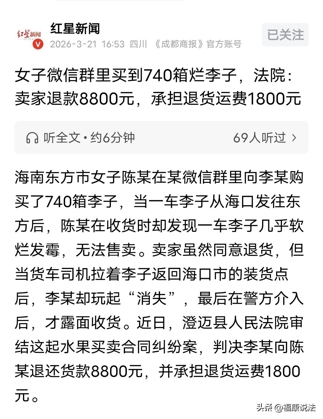 海南,女子在微信群花8800元买了740箱李子,加上600元运费,共支付卖家9400元,却收到一车烂果,无法售卖。女子找卖家退货,卖家同意由原车运回,女子又支付司机1800元运费,不料,司机将货送到地方,卖家却玩消失,司机等了一天,无奈报警,卖家这才出面收货,但一直不给女子退货款、运费。女子一气之下将卖家告上法院,要求退还11200元货款、运费。法院这样判了。 2025年9月13号,陈某在一个叫“特价水果群”的微信群里刷消息,一眼看到李某在卖李子。 李某发的信息看着挺诱人,价格不贵,一箱才12块钱。 陈某加了他好友,问清楚是从海口发货,包运费送到家。 双方一算,740箱李子,总共8880块,李某还挺爽快,给抹了零头80块,实收8800块。 陈某觉得挺划算,二话不说,当天下午就把9400块(含600块运费)全部转给了李某。 9月13晚上,陈某买的740箱李子,按理说应该在当晚9点半到货。可到了晚上10点多,货车才到,陈某打开箱子一看,当时就傻眼了! 740箱李子,几乎箱箱都是软烂的,有的甚至已经发霉、软烂,根本没法拿出去卖。 陈某急得团团转,立马拍照片发给李某,问他这咋整。 李某看了照片,也承认货有问题,痛快地地说:“那退货吧,原车拉回来就行。” 陈某松了口气,赶紧联系司机,商量着把这批烂李子拉回海口,返程运费1800块,陈某当场就付给了司机。 本以为事情圆满解决,没想到才是噩梦的开始。 第二天凌晨,货车拉着740箱烂李子到了海口装货点。 司机联系李某来收货,李某的态度却一百八十度大转弯,让司机换辆车,司机不干。 然后,李某又让工人搬货,可他却没有出现接收货物。 司机就等啊等,等到了9月14号晚上,等不下去了,选择了报警。 这回李某出现了,收下了这批烂李子。 但是,李某却一直不给陈某退货款。 陈某一次次催,对方要么不回消息,要么敷衍了事。 陈某气坏了,这740箱烂李子自己买的亏大了,还倒贴了1800块的返程运费。 她忍无可忍,一纸诉状把李某告到了法院,要求退还货款8800块,并赔偿去程运费600块和返程运费1800块,总共11200块。 法庭上,李某倒是承认收了钱,但开始找各种借口。他说发货前就通过微信告诉过陈某,货里有坏果是正常的。 是陈某自己同意才发的。至于那1800块返程运费,他更是不认账,说这是陈某自己选的退货方式,跟他没关系。 法院会怎么判呢? 不管是线上还是线下,买家花钱买货,卖家应该发品质正常的货物。 李某一开始说货有瑕疵,这顶多是“轻微瑕疵”,可以便宜点卖。 但他发给陈某的740箱,几乎全是烂的,这根本就是“以次充好”甚至可以说是欺诈,完全违反了基本的买卖规矩。 别说事先告知了,就算说了,也不能把一车烂货当合格产品卖啊! 《民法典》577条规定:当事人一方不履行合同义务或者履行合同义务不符合约定的,应当承担继续履行、采取补救措施或者赔偿损失等违约责任。 李某交付的货物质量严重不达标,构成了根本违约,就得承担违约责任,不能因为提前提了一嘴有坏果就逃脱责任,该退钱就得退钱,该承担运费就得承担。 更让人不齿的是李某退货时的操作。明明说好退货,对方把货运回去了,他却故意躲着不收。 这导致烂李子在返程途中进一步腐烂,等于他还在那儿“坐视损失扩大”。这是人品问题。 另外,陈某在买之前就知道是特价水果,多少也预料到可能有坏果,这个风险她得自己扛。所以,法院认定先前的600元运费得陈某自己承担。 最终,法院判决:李某返还陈某8800元货款,运费1800元。 这件事给所有做买卖的,尤其是在群里买东西的人提了个醒: 第一,证据最重要! 陈某能赢,全靠她完整保留了微信聊天记录和验货的照片,这就是铁证。 第二,遇到这种生鲜烂货,一定要第一时间固定证据,然后果断维权,别因为怕麻烦就忍了。 说到底,生意做不长久,不是因为赚不到钱,而是因为丢了良心。 想靠耍小聪明骗一顿饭钱、一车水果钱,最终失去的可能是别人永远的信任。