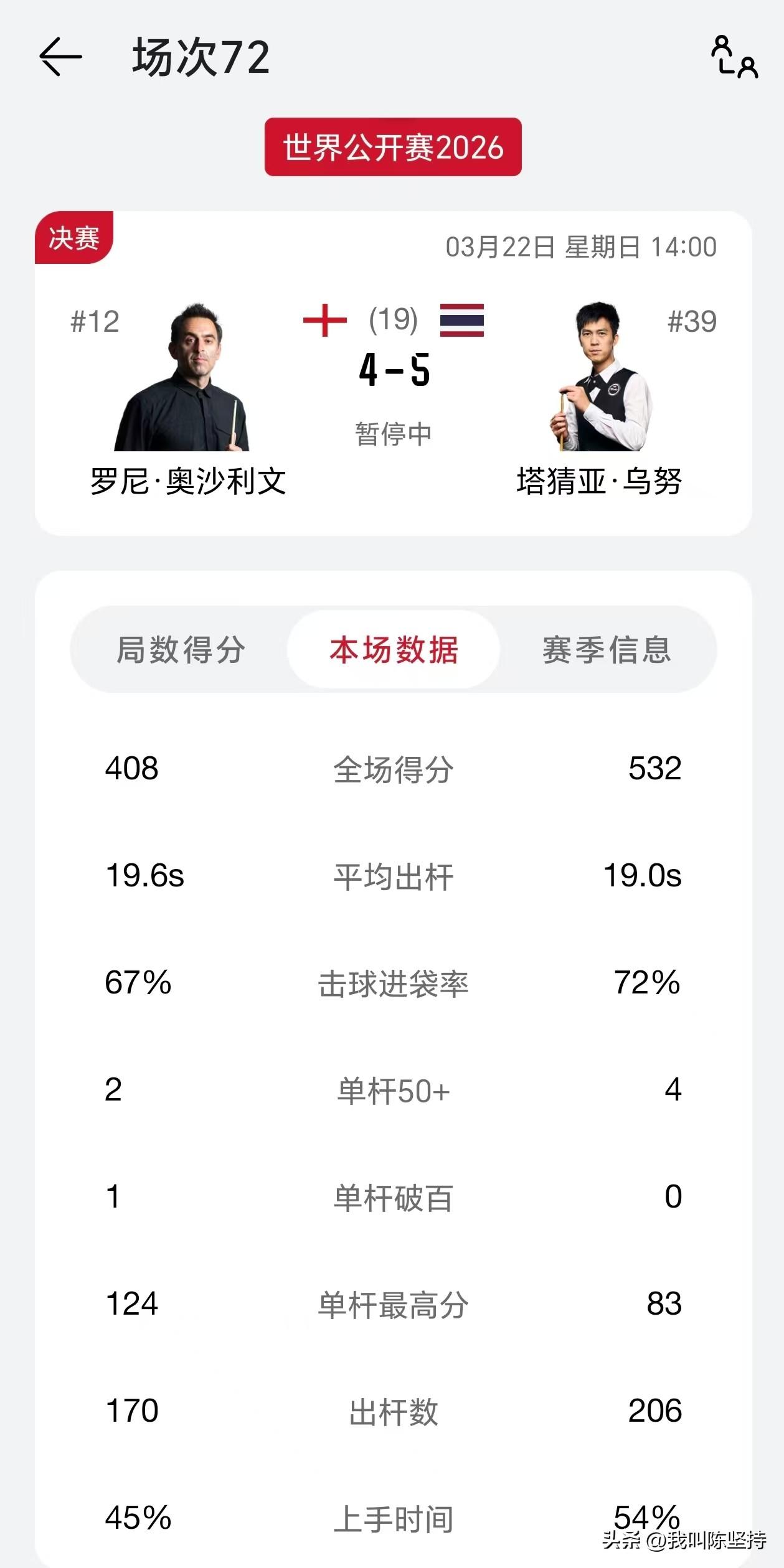真是神鬼莫测,奥沙利文4-0领先,竟然被连鞭5局。 玉山公开赛决赛,前4局,火