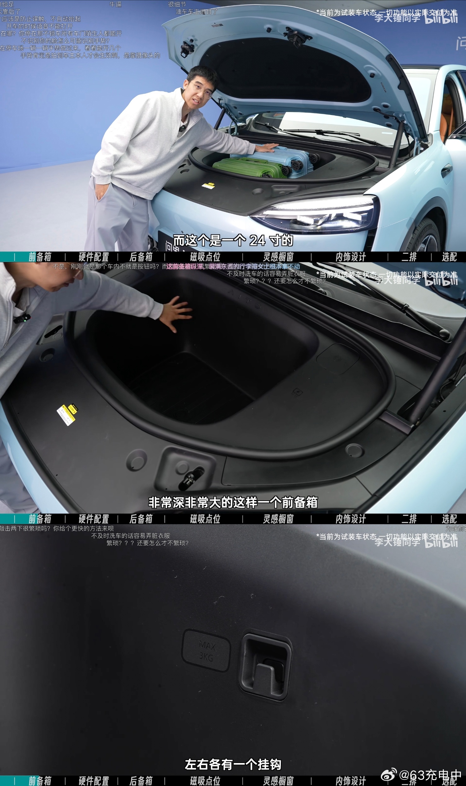 空间非常大,但是可以看出来前备箱到车头前端的距离还是有点长的,拿去大件行李的时候没那么方便。