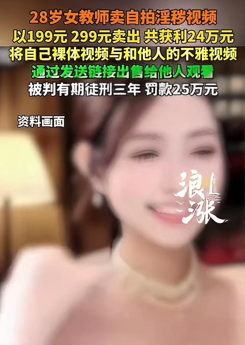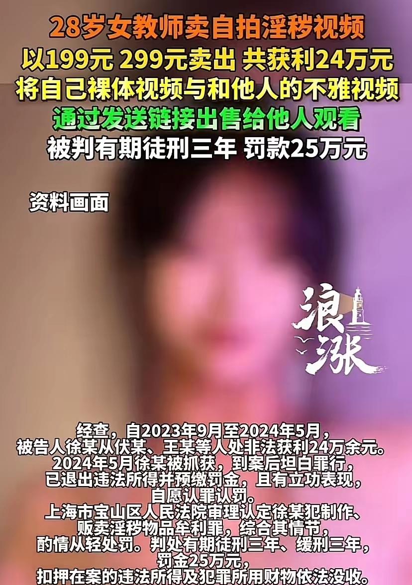 “赔了夫人又折兵!”湖南衡阳,28岁中专女教师将自拍的淫秽物品拿出去卖,短短8个月便赚了24万余元。然而好景不长,钱还没捂热,便被警方发现,最终悲剧了,赚得24万余元全部被没收,还获刑并被罚了25万元! 1998年出生的徐某,老家在湖南衡阳,原本在当地一所中专当老师、二十出头得年纪,能有这样一份安稳职业,在旁人眼里已是十分幸运,可她却总想着赚快钱 2023年9月到2024年5月的八个月里,她先是在微信群发闪照和自我介绍,吸引男性网友添加好友,随后以一百九十九元到二百九十九元的单价,兜售自己拍摄的不雅视频,甚至包含与他人的私密影像,累计非法获利二十四万余元 。 法网终究不会漏掉任何违法者,2024年5月,警方根据线索将徐某抓获,经专业鉴定,她售卖的多部视频都属于淫秽物品,随即因涉嫌制作、贩卖淫秽物品牟利罪被立案调查! 被抓后,徐某选择了坦白,不仅主动上缴全部违法所得,还积极提供同行线索,协助警方破获另一宗类似案件,被认定有立功表现,最终上海宝山区法院审理后,判处她有期徒刑三年、缓刑三年,没收违法所得与犯罪工具,同时处以二十五万元罚金 。 这起案件地审理地点引发不少讨论,跨地域管辖得背后,和网络犯罪地服务器位置、资金流向等因素有关、亦有部分人对量刑尺度提出疑问,担心会给线上牟利型犯罪释放错误信号,削弱法律的震慑力。 但从法律层面来看,法院是综合徐某的犯罪事实、认罪态度、立功表现等多方面因素才做出判决,既给她改过自新的机会,亦守住法律地刚性底线! 好好的教师不当偏走歪路,24万没还丢工作,唉太可惜了,其实不少网友地感慨,也说出很多人的心声,明明有安稳前路,偏要伸手碰法律红线,实在得不偿失! 徐某的遭遇,不只是失去了二十多万元的违法所得,背上巨额罚金,更要为自己的行为付出更多代价、根据相关法律规定,她因受刑事处罚将丧失教师资格,彻底告别教师行业,未来的职业发展也会留下难以抹去的污点、更别说她售卖他人私密影像的行为,若没经过对方同意,还可能面临民事侵权索赔 。 在我看来,徐某得下场完全是自作自受,原本握着旁人羡慕的安稳工作,却因为贪念和侥幸,亲手砸自己的饭碗,还赔上名声和前途,君子爱财本无可厚非,但必须走正路,别总想着赚快钱得歪门邪道,不然迟早要为自己的行为买单! 这事你怎么看?