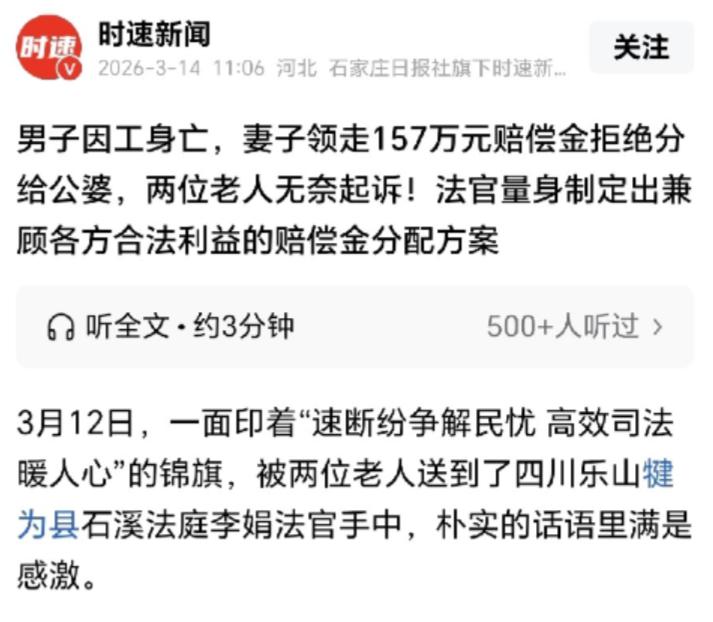 “金钱再次将亲情打败!”四川乐山,一男子工伤死亡,赔偿款157万元打到妻子账上,妻子认为,这笔钱归自己和孩子所有,丈夫死亡,这是他们未来的保障,可公婆老年丧子,身体衰弱,也想分走一部分养老,公婆问儿媳要钱,儿媳一分不给,公婆告到法院,结果令人意想不到。 最近四川乐山发生的一件事,让人看了心里五味杂陈,都说血浓于水,可在157万赔偿款面前,一家人却闹得不可开交,甚至闹上了法庭。 事情得从2025年10月说起,乐山犍为县的一位男子刘某,在工作时不幸发生工伤,没能抢救过来,就这样突然离开了人世,家里的顶梁柱倒了,原本就不算富裕的家庭,一下子陷入了悲痛之中。 按照规定,用人单位给刘某的亲属赔偿了157万元,这笔钱全部打到了他妻子廖某的账户上,廖某拿着这笔钱,心里满是沉重,她觉得这笔钱是丈夫用命换来的,理应归自己和两个孩子所有。 家里有一个已经成年的女儿,还有一个未成年的儿子,丈夫走了,以后抚养孩子、维持家庭开销,全得靠这笔钱,这是她们娘仨未来的唯一保障,所以她压根没想着要把钱分给公婆。 可另一边,刘某的父母,年纪已经不小了,老年丧子的痛苦让他们备受打击,身体也一直不太好,儿子没了,以后没人给他们养老送终,手里也没有多少积蓄,看到儿媳把157万全部攥在手里,一分钱也不分给他们。 可老两口心里很不是滋味,多次找廖某商量,希望能分一部分钱,给自己养老用,老两口的诉求也不过分,养儿防老,如今儿子不在了,他们失去了唯一的依靠,想分点赔偿款保障晚年生活,也是人之常情。 可廖某态度很坚决,任凭公婆怎么说,她都不肯松口,一分钱也不愿意给,几次沟通下来,双方的矛盾越来越深,从一开始的好好商量,变成了后来的争吵不休,原本和睦的一家人,彻底闹僵了。 老两口实在没办法,看着儿媳态度强硬,又想着自己的养老问题,只能硬着头皮,把儿媳廖某告上了法庭,希望通过法律途径,要回属于自己的那一部分赔偿款。 当时很多人都以为,这场官司肯定会闹得鱼死网破,要么是儿媳赢了,公婆一分钱拿不到,要么是公婆赢了,娘仨的生活没了保障,亲情彻底破裂,可谁也没想到,最后的结果却很暖心。 承办法官接手这个案子后,并没有急于下判决,他知道,这不是一场简单的财产纠纷,背后是两个破碎的家庭,一旦处理不好,只会让亲情彻底无法挽回。 法官多次找双方沟通,一边安抚老两口的情绪,一边给廖某讲法律规定,告诉她,这笔工亡赔偿款不是她一个人的,也不是夫妻共同财产,而是给死者所有近亲属的补偿,公婆作为刘某的父母,有权分得一部分。 经过法官多次耐心调解,双方慢慢打开了心结,也开始互相体谅,廖某明白了公婆的难处,老两口也理解了廖某独自抚养孩子的不易。 最终,双方达成了调解协议:公婆分得40万元养老,已经成年的长女分得30万元,未成年的次子分得50万元,老两口和长女也自愿放弃了对刘某其他遗产的继承权利。 如今,这笔赔偿款已经全部支付到位,一场因为钱引发的家庭纠纷,终于得到了圆满解决,其实仔细想想,这件事没有谁对谁错,廖某想守护孩子的未来,公婆想保障自己的晚年,都是出于无奈。 只是很多时候,金钱固然重要,但亲情更不能被辜负,遇事多换位思考,多一份理解,才能守住一家人的温暖。