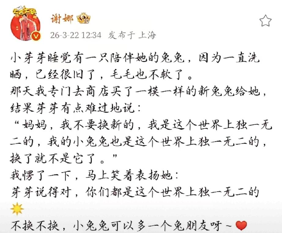 谢娜被夸会教!5岁女儿一句话引全网点赞,育儿方式太高级 尽管不少人对谢娜的主持风格有争议,但她的育儿智慧真的值得肯定! 谢娜晒出给女儿小芽芽换玩具兔的日常,旧兔子因反复洗晒变硬,她特意买了同款新兔,没想到5岁女儿暖心拒绝:“我是独一无二的,我的小兔兔也是,换了就不是它了。” 谢娜没有强行说教,先肯定女儿的想法,再温柔引导“给小兔兔添个朋友”,轻松化解问题。小小年纪就有这般通透认知,足见谢娜和张杰的教育用心,温柔又有智慧! 谢娜星光盛典 谢娜舞台