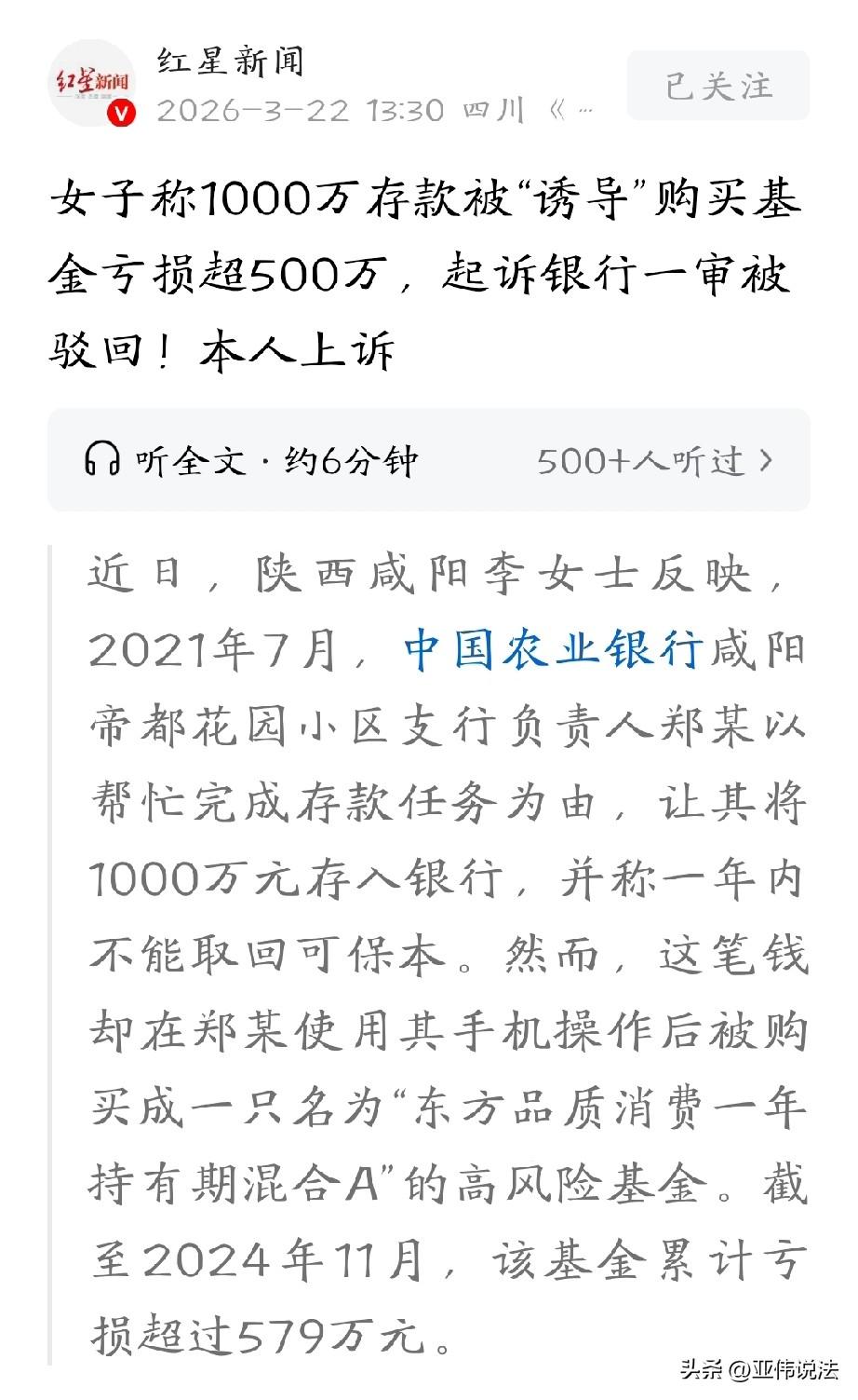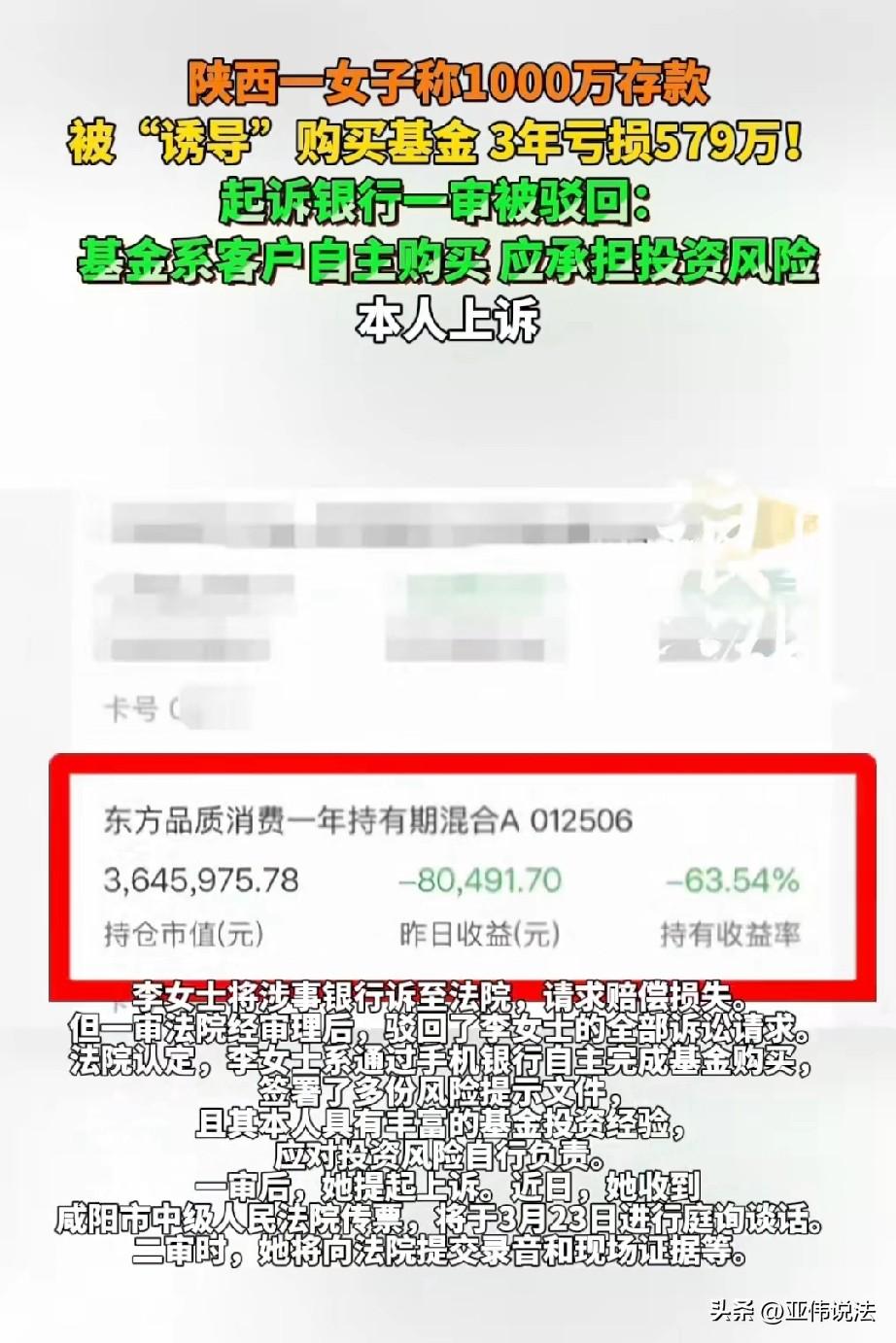 亏麻了!陕西咸阳,女子接到银行工作人员电话,说想让她帮忙完成1000万的存款业务,但承诺绝对保本。出于信任,她同意了,但万万没想到,对方竟然操作她的手机,私自购买了一只高风险基金,期间还多次组止她赎回,结果三年多时间,亏了579万元。女子气个半死,她觉得自己被银行利用和忽悠,将银行告上法庭,要求赔偿损失。 李女士怎么也没想到,存在银行里的一千万,短短三年,竟然会蒸发掉五百多万。 2021年6月底,李女士接到了银行负责人郑某的电话,郑某在电话里说,能不能帮个忙,完成一下1000万的存款业绩任务? 1000万可不是个小数目,她有些犹豫,对方赶紧表示,钱存进来就行,一年内别取,郑某还特意强调了一句,可保本。 李女士一听是“保本”的,心里踏实了不少。 她跟这家银行打了多年交道,她所在的企业一直在这开基本户,跟郑某也算是老熟人了,信得过,于是,她答应了下来。 2021年7月1日,郑某亲自来到了李女士的办公室,李女士把手机交给了郑某,让他帮忙操作。 整个过程中,郑某一个人拿着手机在那点来点去,也没跟李女士多说什么风险不风险的事,李女士当时也没多想,以为就是在办存款。 可后来她一查,发现不对了,那一千万根本没存成定期,而是被买成了一只叫“东方品质消费一年持有期混合A”的基金。 她后来才知道,这只基金风险等级是“高风险”,而且每笔份额至少要持有一年才能赎回。 李女士当时就懵了,但钱已经进去了,一时半会儿也取不出来,她只能等。 到了产品可以赎回的时候,李女士开始频繁联系郑某,问这基金现在怎么样、风险大不大、该不该赎回。 可郑某每次都安慰她,说“现在已经是最低点了,不可能再往下跌了”,还说什么“有内部消息”,让她再等等,别急着卖。 李女士信了,一等再等,基金净值一路往下掉。 等到2024年11月,她打开账户一看,那一千万已经亏了五百七十九万多。她的心情跌到了谷底,一千万的本金,只剩下一小半。 李女士气炸了,什么都没干,1000万就蒸发掉了一半,太坑了。 她认为是银行的工作人员利用她的信任,诱导她买了超出自己风险承受能力的产品,而且自始至终都没跟她讲清楚风险,还一再劝阻她赎回,导致损失越来越大。 银行和工作人员要为自己的损失买单,所以,她一纸诉状把银行告上法庭,要求赔偿。 法院调查审理明确,这只基金是李女士通过手机银行自己操作的,整个过程需要输入密码、登录账户,还要签署《风险提示书》《基金产品信息概要》这些文件,每一步都得本人点确认。 银行那边还提供了记录,显示她在购买前做过风险评估,测评结果是“激进型”,完全适合买高风险产品。 其次,法院发现李女士并不是第一次买基金。她在2015年就开过证券账户,2020年到2021年间还买过多家基金公司的产品,算是有经验的投资者。 一个有投资经验的人,应该分得清存款和基金的区别,也应该知道高收益背后就是高风险。 最关键的是,李女士到现在都还没把基金赎回,账户里的亏损只是账面浮亏,还没有真正变成实际损失。 既然还没赎回,这个损失到底是多少,现在还说不好。 至于李女士说的“郑某用她手机独自操作”“承诺保本”“用内部消息劝阻赎回”这些说法,法院认为她没能拿出足够有力的证据来证明。 《全国法院民商事审判工作会议纪要》第72条规定∶适当性义务是指卖方机构向投资者推介产品、提供服务过程中必须履行的了解客户、了解产品,将适当的产品或服务销售或者提供给适当的金融消费者等义务。 银行已完成风险评估、风险提示、产品匹配等适当性义务,有电子签约、风险测评、交易留痕等证据佐证。 李女士为有投资经验的投资者,应区分存款与基金,其主张的代操作、保本承诺等,不构成确定实际损失。 综上,一审法院判决,银行不用承担赔偿责任。 李女士不服,提起了上诉。她说自己手上有录音,还有现场的证据,二审的时候会提交,希望能为自己讨回一个公道。 李女士的遭遇也给大家提了个醒,基金有风险,投资需谨慎,千万不要因一时糊涂,让自己的辛苦钱打了水漂。