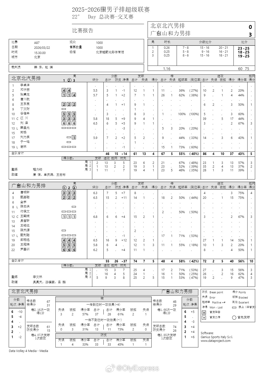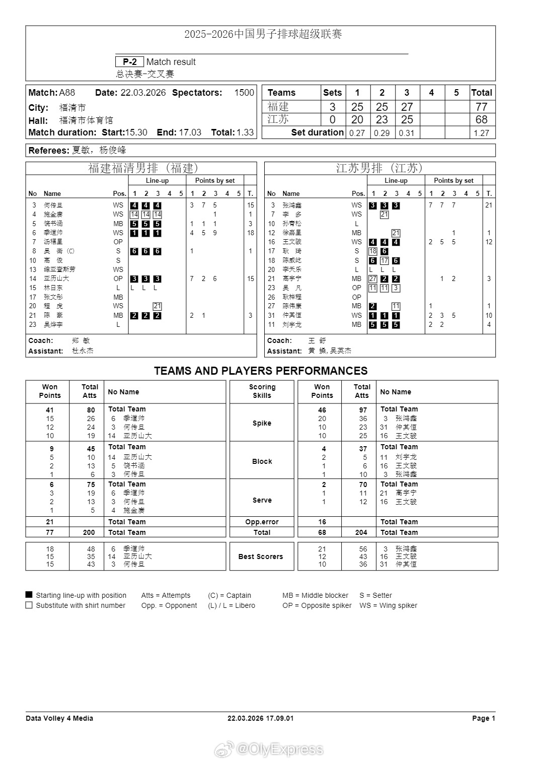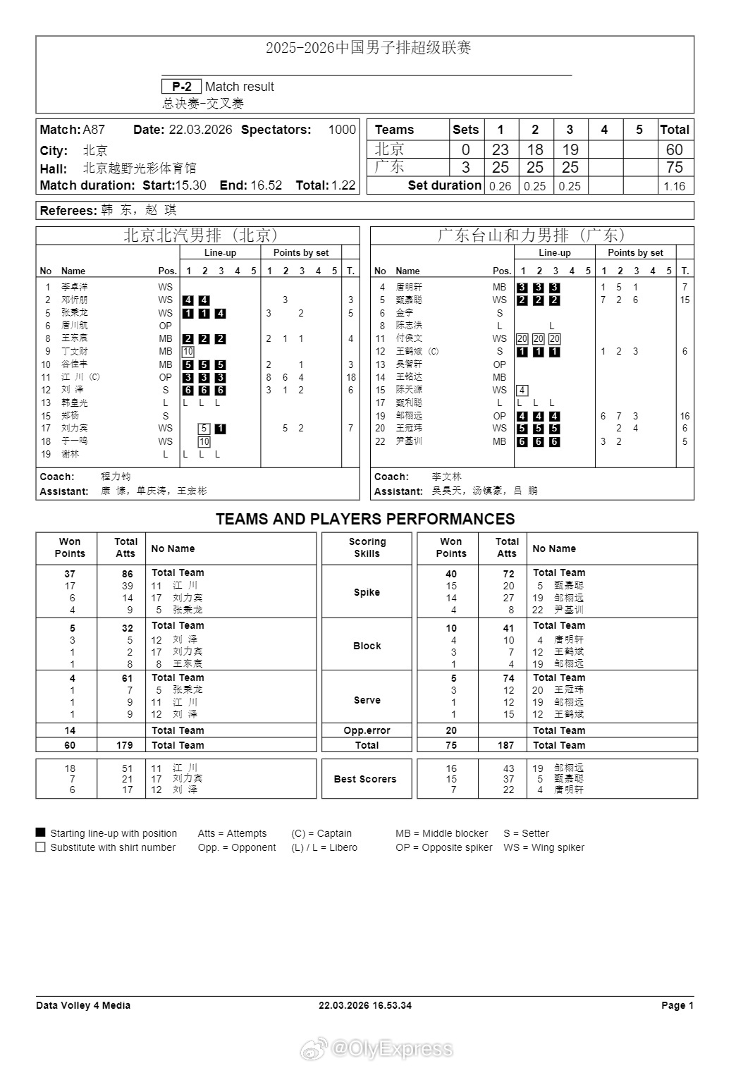 【排超男排联赛粤闽争第五 京苏争第七】排超联赛 3月22日,排超男排联赛5-8名排位赛第二回合结束,广东和福建分别再次战胜北京和江苏,两回合双杀对手,将争夺第五名;北京和江苏将参加七八名决赛。今日两场赛果如下:福建3-0(25-20/25-23/27-25)江苏北京0-3(23-25/18-25/19-25)广东