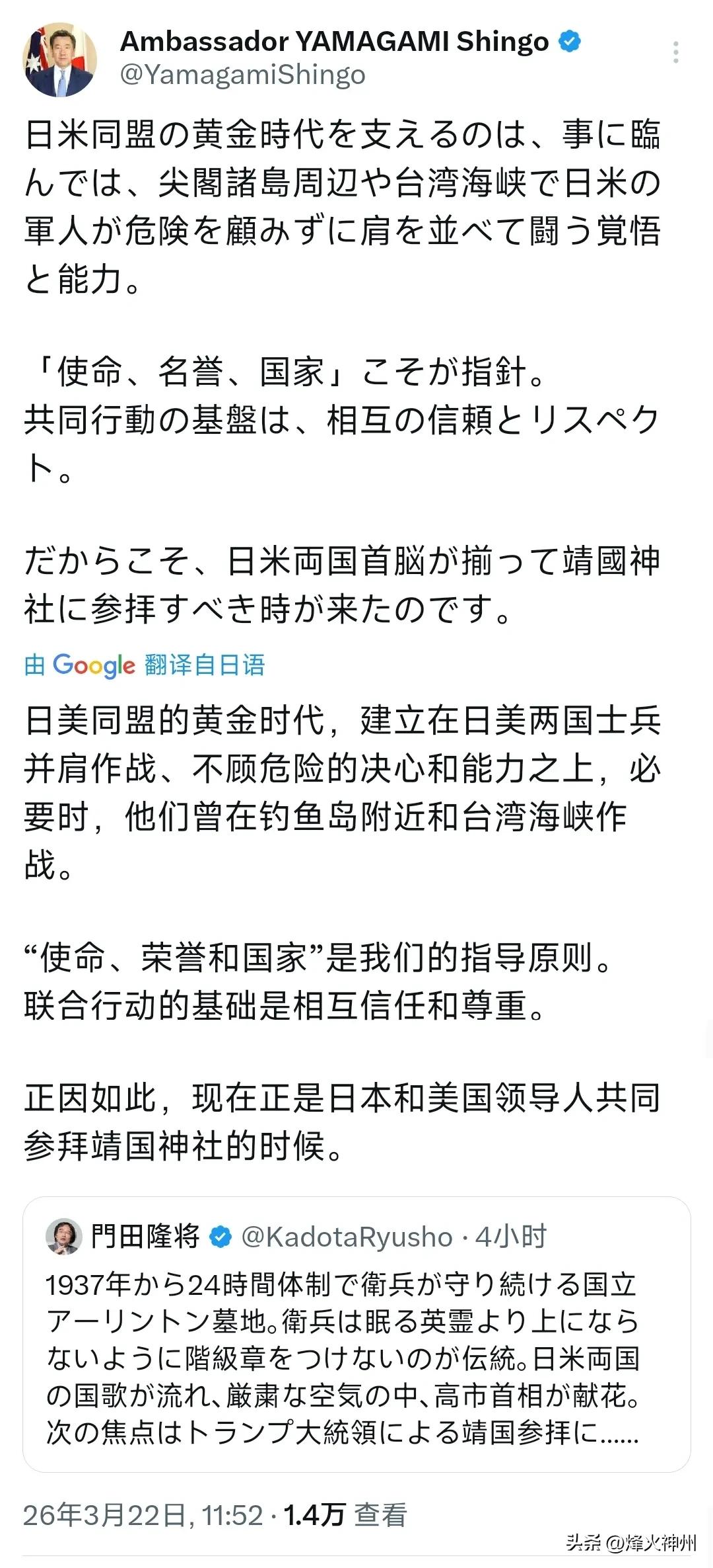 日本大使呼吁特朗普和高市早苗共同参拜靖国神社。 日本驻澳大利亚大使山上信吾今天(3月22日)叫嚣道:“支撑日美同盟黄金时代的,是日美军人在尖阁诸岛周边和台湾海峡不顾危险并肩作战的决心和能力。‘使命、荣誉、国家’正是我们的指引。共同行动的基础在于相互信任与尊重。正因如此,如今正是日美两国首脑共同参拜靖国神社的时候了。” 【山上信吾转发了日本右翼作家门田隆将的发文,在高市早苗访问华盛顿阿灵顿国家公墓后,门田隆将呼吁特朗普参拜靖国神社。】 评几句: 日本驻澳大使山上信吾公然叫嚣,呼吁特朗普与高市早苗共同参拜靖国神社,还妄谈使命荣誉,这番言论荒谬至极,令人齿冷。靖国神社供奉着二战甲级战犯,是军国主义的罪恶象征,此举本质是为侵略历史翻案,践踏二战受害国人民的情感与国际公理。 高市早苗访美期间被拿珍珠港事件调侃仍卑躬屈膝,转头便裹挟美方一同“拜鬼”,将谄媚外交与历史翻案绑定,尽显右翼政客的虚伪与疯狂。这位大使借所谓日美同盟煽风点火,妄图把战犯牌位当成外交筹码,把侵略罪行包装成共同信仰,既无视历史正义,也暴露其挑衅地区和平的险恶用心。 一边对历史伤痛毫无反省,一边把战犯招魂当作政治表演,这种突破良知底线的行径,只会让日本在国际社会更加孤立,终将被历史和正义彻底唾弃。