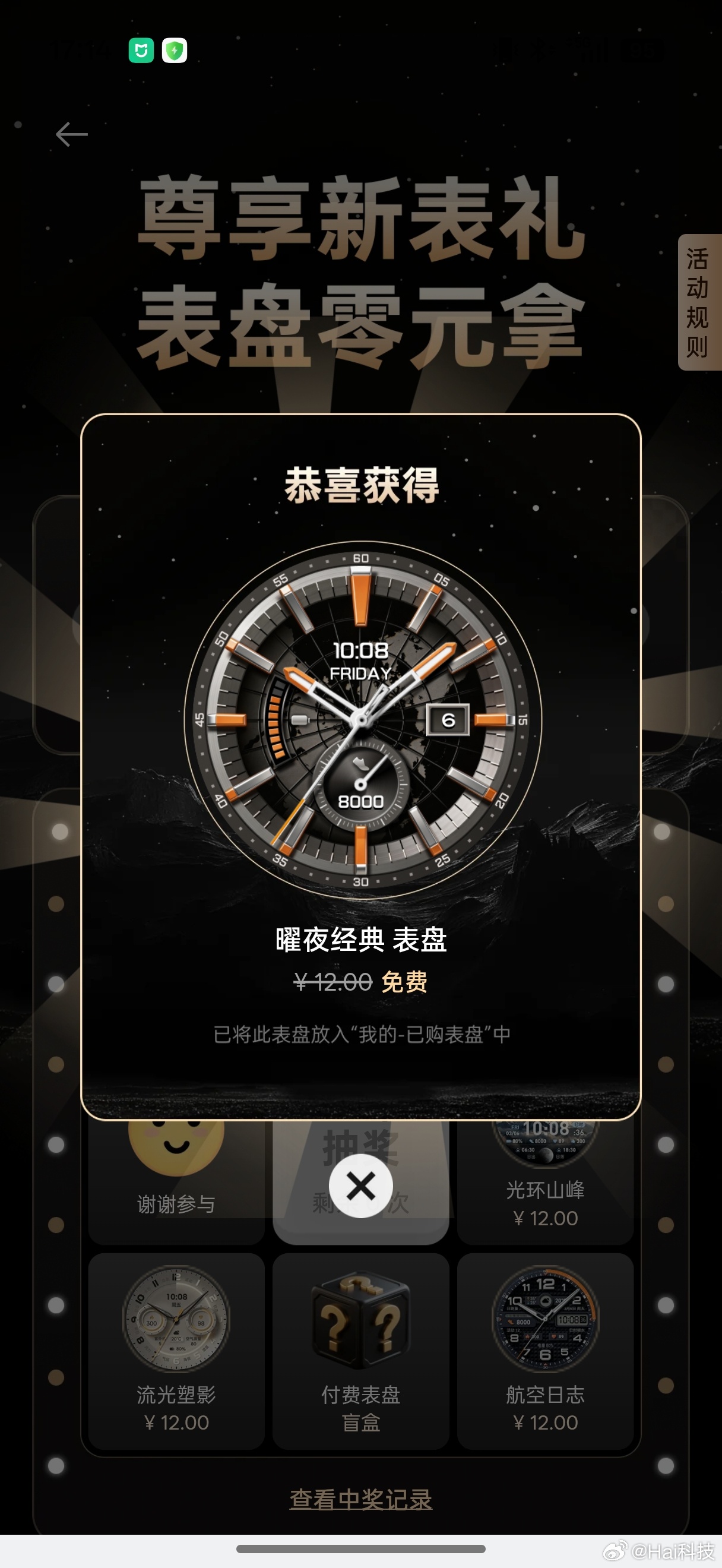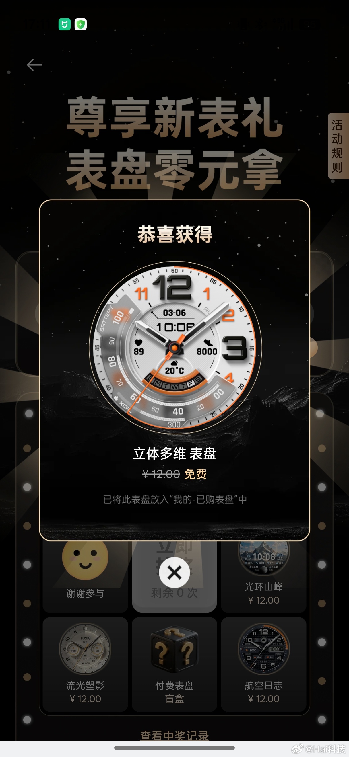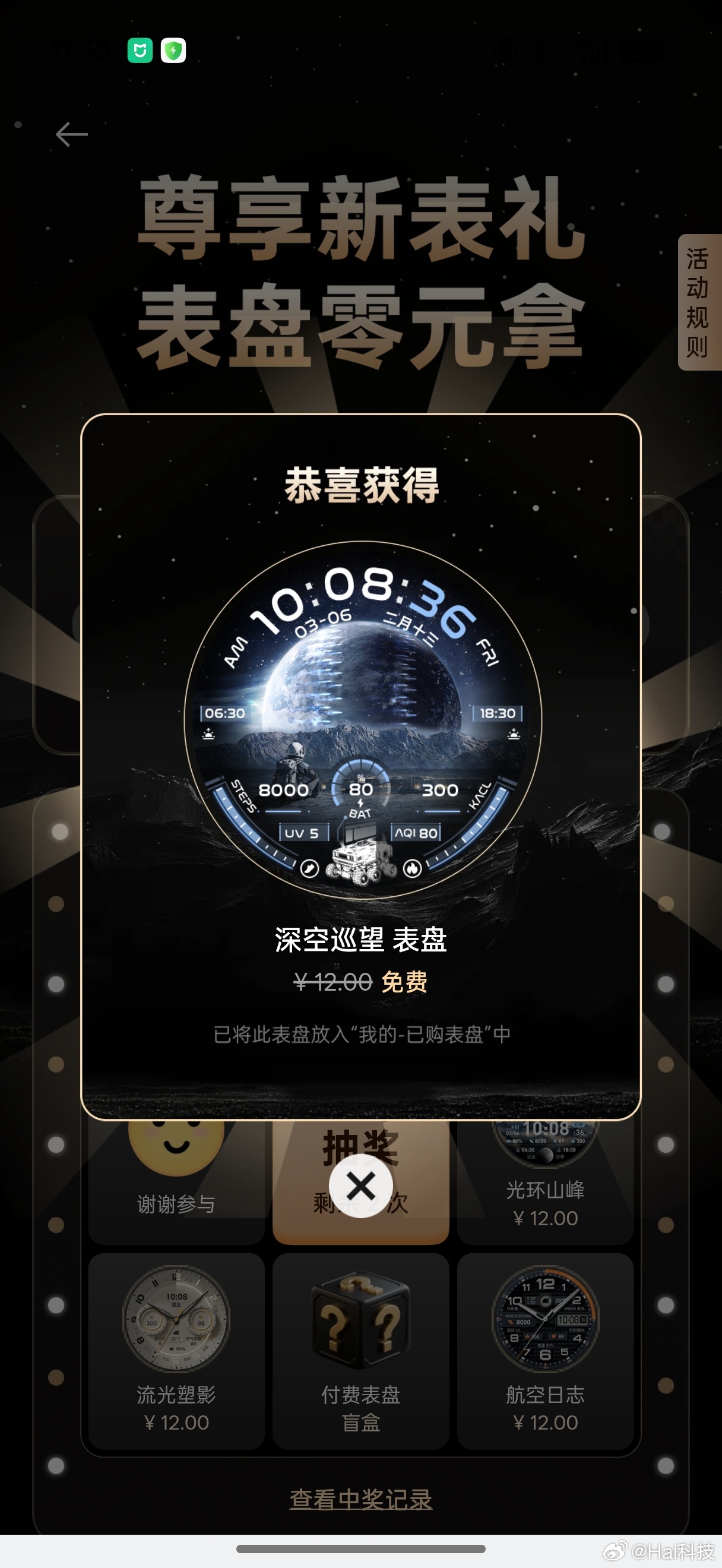 提醒下,OPPO Watch X3有首周新表礼,抽了7次送了7个12元的表盘竟然