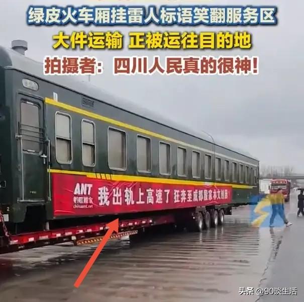 看到拖车拉着火车(绿皮的),震惊,上面的一幅标语封神-我出轨上高速了,狂奔至成都