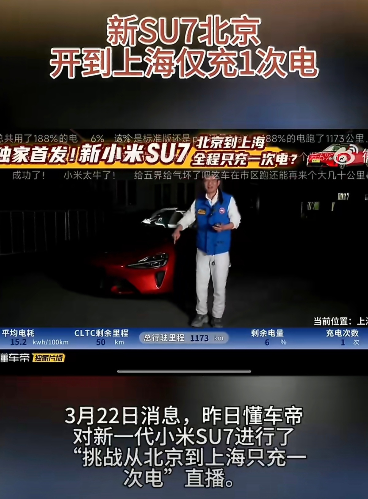 小米汽车小米科技新SU7北京开到上海仅充1次电雷军回应媒体北京上海高速续航实测