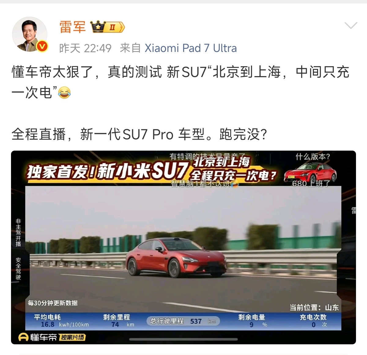 而昨天,懂车帝驾驶了新一代小米SU7 Pro,挑战从北京出发来往上海,并全程进行了直播,最终懂车帝的测试人员完成了挑战。