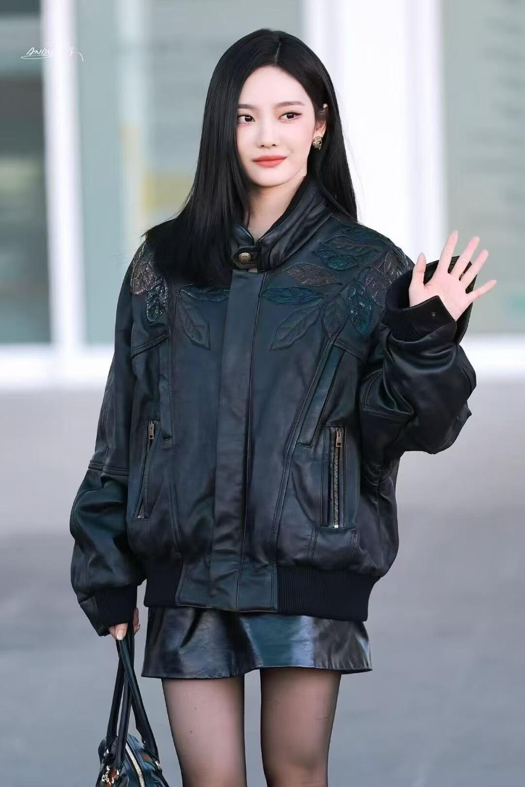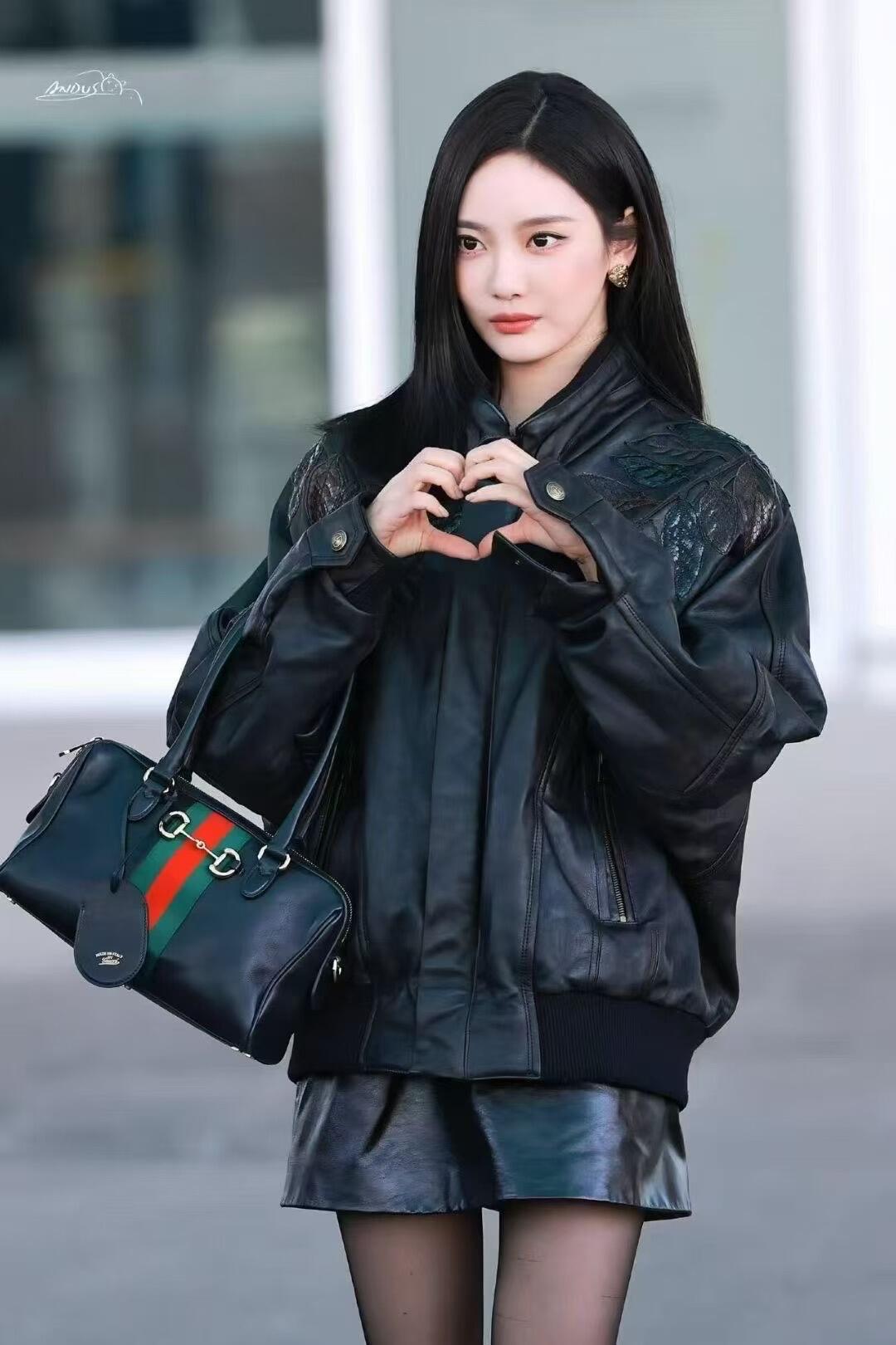宁艺卓近照宁艺卓米兰出发look,复古皮衣搭配Borsettto手袋,黑长直发,