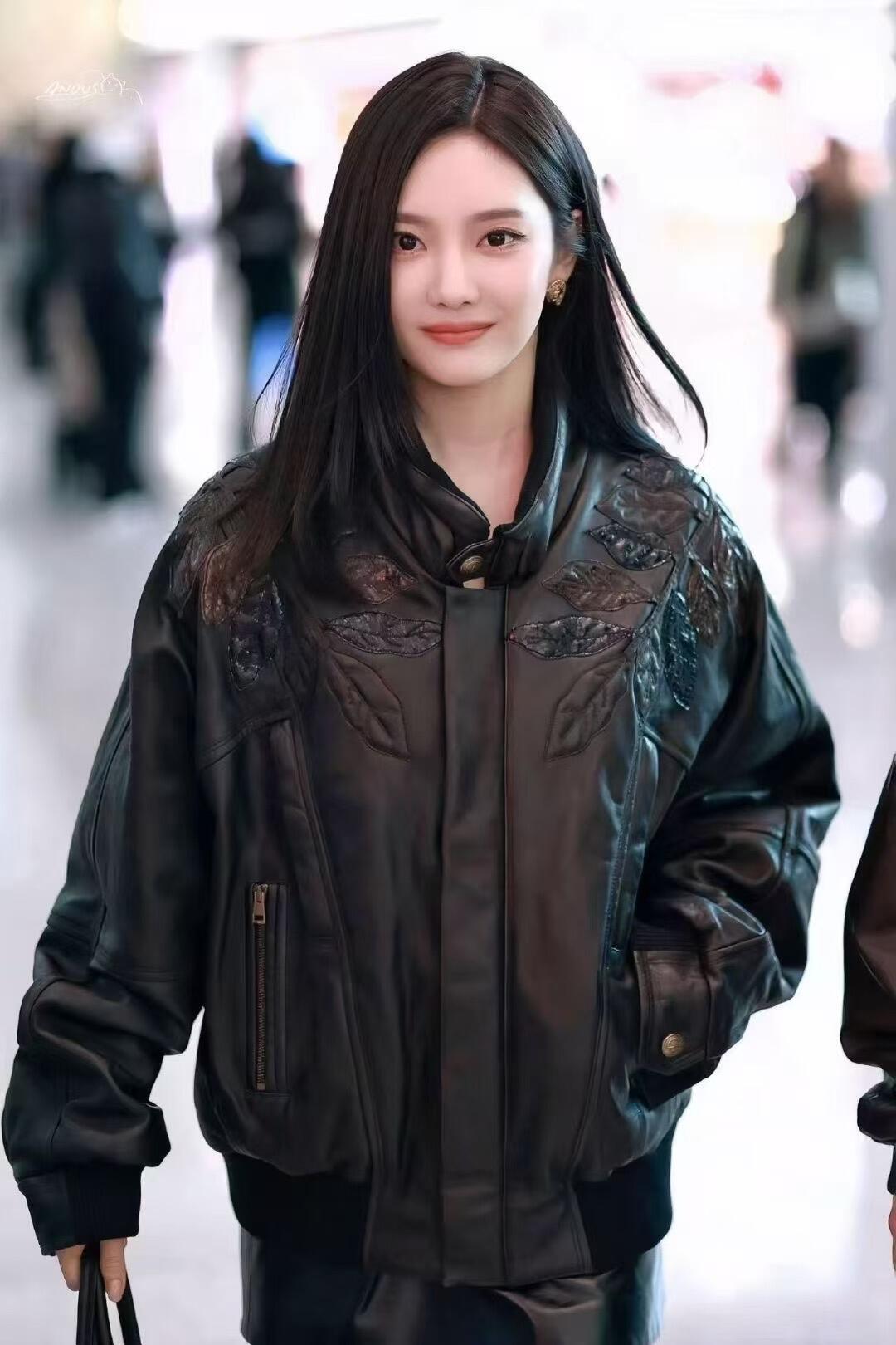 宁艺卓近照宁艺卓米兰出发look,复古皮衣搭配Borsettto手袋,黑长直发,满屏的大长腿,松弛高级。