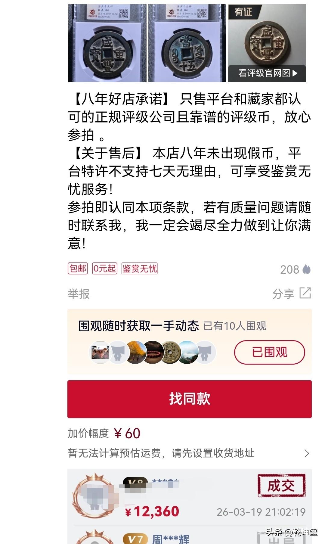 一万二千多值吗? 3月19日,在某拍堂成交了一枚咸丰宝源当五十大样,评级分是84分,品相如图。 经过多次竞拍,最后以12360元成交,大家看看它值不值呢? 这枚咸丰大钱,整体来说很不错,边道规整,穿口方正,字体流畅无黏连,84分,实至名归!这样的钱币会成为收藏者的心爱之物!这两枚钱币是乾隆手吗 大神们看看这枚钱币值多少米 咸丰大铜钱 咸丰重宝铜钱 咸丰当五百母钱