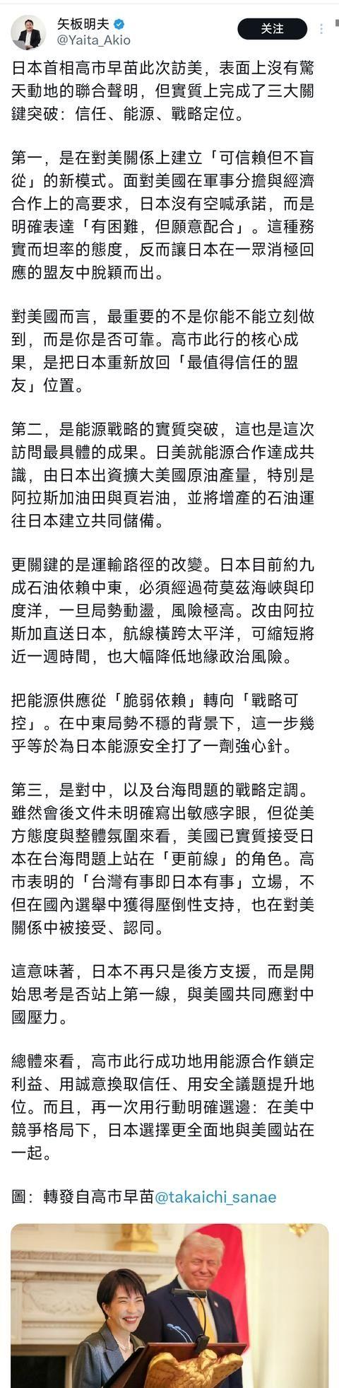反华分子、日本媒体人矢板明夫评价高市早苗访美成果:“日本首相高市早苗此次访美,表面上没有惊天动地的联合声明,但实质上完成了三大关键突破:信任、能源、战略定位。 这次访美是她就任首相后第一次正式去白宫,2026年3月19日,她和美国总统特朗普在椭圆形办公室举行会谈。双方没有发布联合声明,这点和很多人预期的不一样,会谈主要谈了几个实际问题,包括中东局势、伊朗相关行动,还有日本在霍尔木兹海峡的角色。 日本没有答应派军舰护航,但表达了支持稳定能源市场的立场。这段插曲让外界注意到美日沟通的复杂性。 矢板明夫在会谈后很快发文分析,他认为这次访问表面平静,实际完成了三大关键突破。第一是信任方面的突破。 日本面对美国在军事分担和经济合作上的要求,没有随便许诺,而是坦白说有困难,但愿意找办法配合。这种务实态度让日本在盟友里显得可靠。 矢板明夫说,美国看重的是长期可信度,高市这次把日本放回了最值得信任盟友的位置。第二是能源合作的实质进展。 日本同意出资帮助美国扩大阿拉斯加油田和页岩油生产,增产的油会运到日本建立共同储备。这比以前依赖中东石油好多了。 以前日本石油九成来自中东,要经过霍尔木兹海峡和印度洋,风险高。现在走阿拉斯加到日本的太平洋航线,能缩短差不多一周时间,也减少了地缘政治不确定性。 矢板明夫指出,这等于给日本能源安全加了一层保障,在当前中东局势下特别重要。第三是战略定位上的定调。 虽然正式文件没写敏感内容,但从整体氛围和美方反应看,美国接受了日本在台海问题上扮演更积极角色。高市早苗一直主张“台湾有事即日本有事”,这个立场在日本国内有支持,这次访美也得到美方理解。 在美中竞争背景下,日本通过这次访问明确了和美国的配合方向。除了矢板明夫的看法,实际报道也显示这次访问有具体成果。