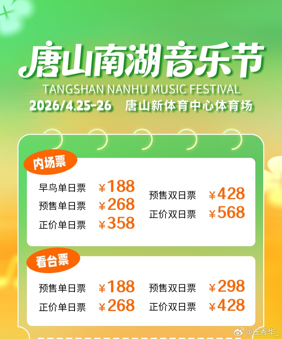赫兹乐队、陈雅森、辉子、雪碧、卢润泽、TANA……每一个名字都值得期待。3月25日开票,2026京津冀第一场音乐节,两天的门票我都要抢到!唐山南湖音乐节