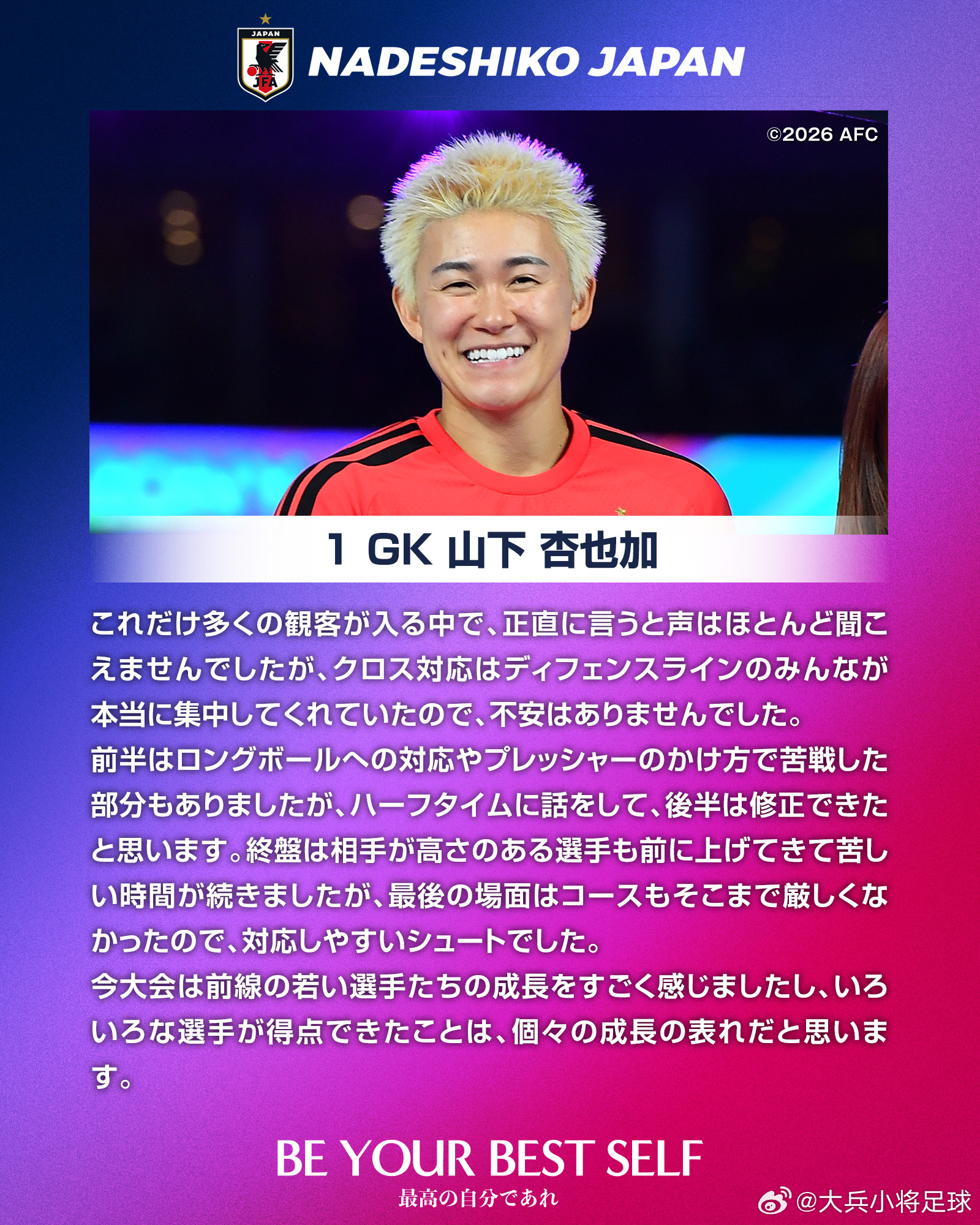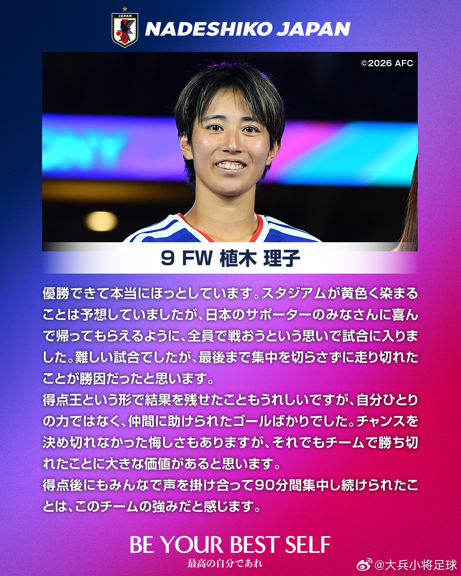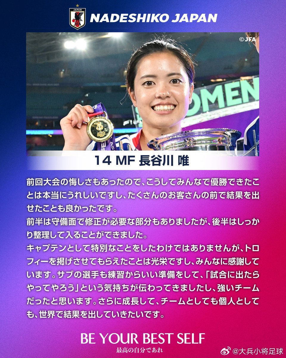 能够夺冠让我如释重负。我们预料到球场会被对手的黄色所覆盖,但依然希望能让远道而来的日本球迷带着喜悦离开,因此全队以共同战斗的信念投入比赛。这是一场艰难的较量,但我们能够始终保持专注并坚持跑动到最后,这是取胜的关键。以“最佳射手”的身份收获个人荣誉让我很开心,但这些进球离不开队友的支持。虽然也有错失机会的遗憾,但能够以团队之力赢下比赛才是最重要的。即便在进球之后,大家依然不断相互提醒、保持专注并坚持90分钟,这正是这支球队的强大之处。