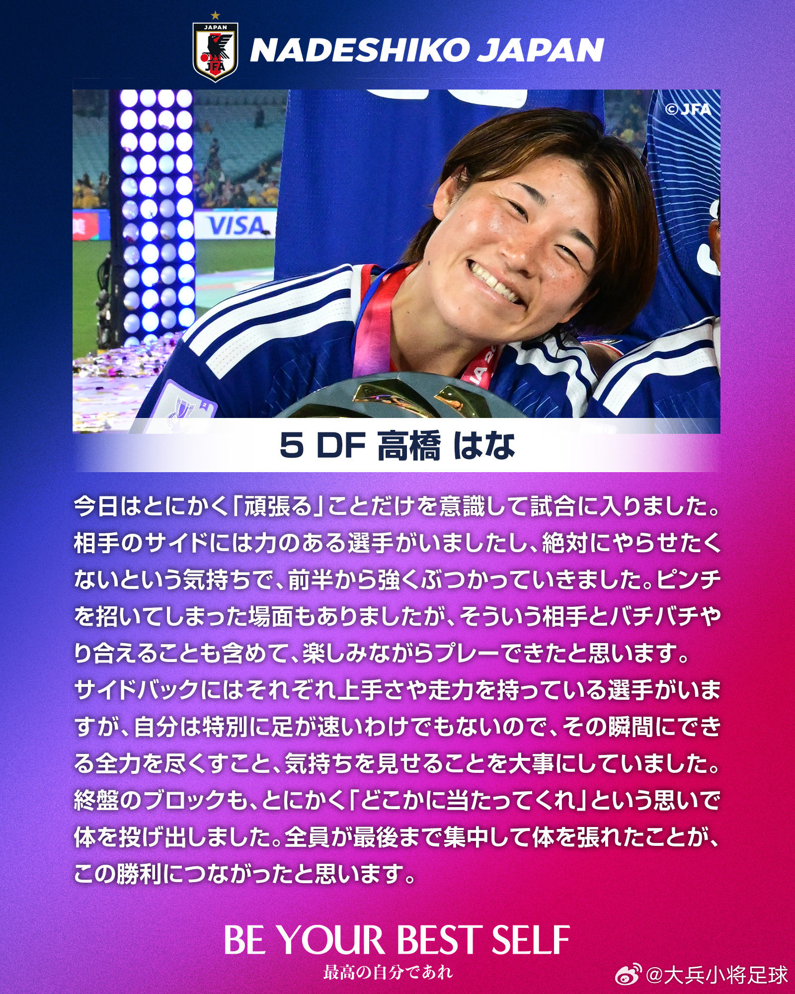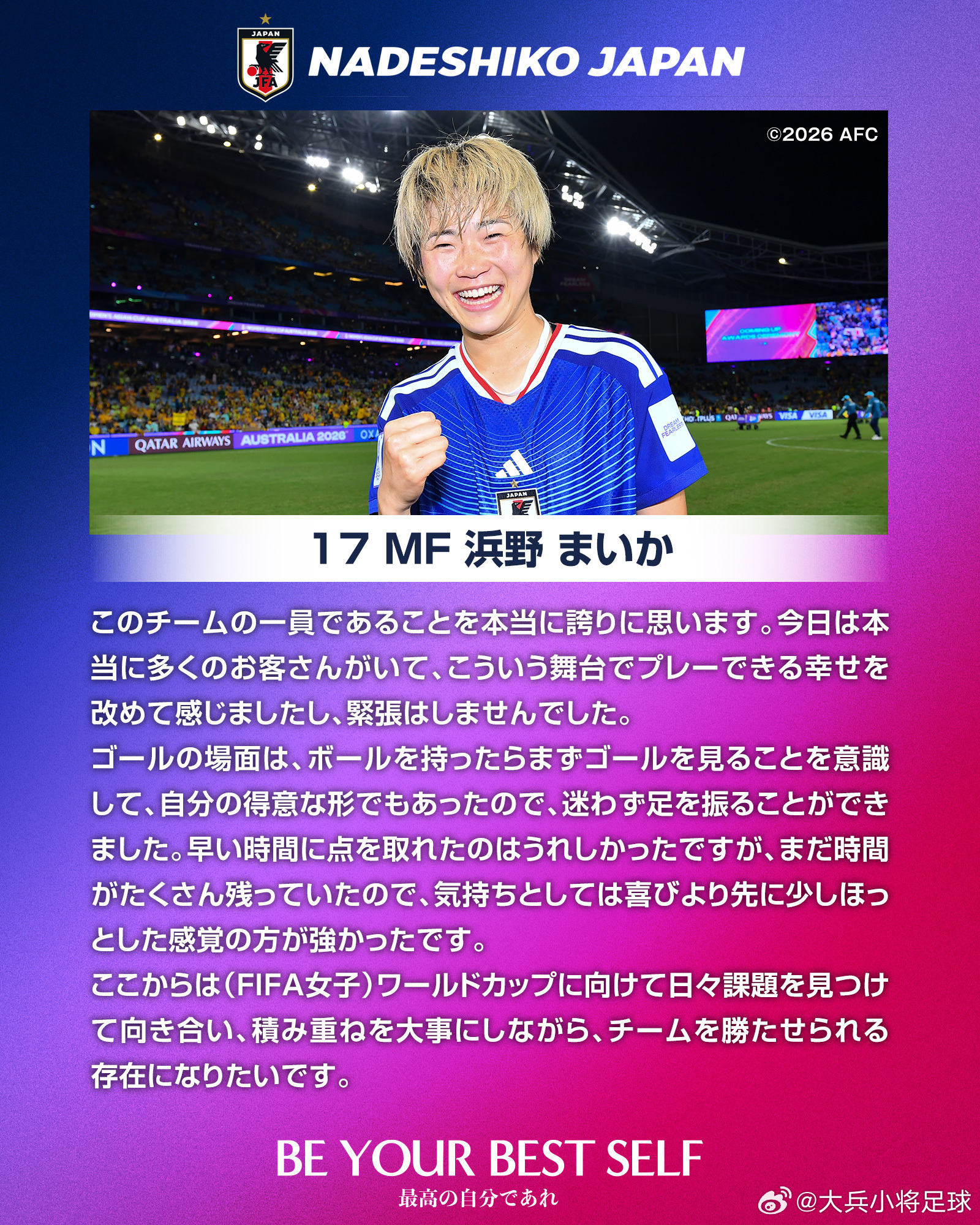 能够成为这支球队的一员,我感到无比自豪。今天现场观众众多,能够在这样的舞台上比赛让我再次感受到足球的魅力,我并没有感到紧张。在进球时,我的第一反应是抬头观察球门,这也是我擅长的处理方式,因此能够毫不犹豫地完成射门。虽然能够在开场不久取得进球令人高兴,但比赛时间还很充足,相比喜悦,更多是一种松了一口气的感觉。接下来我会以(FIFA女足)世界杯为目标,持续发现问题、解决问题,在积累中不断提升,努力成为能够帮助球队赢球的关键球员。