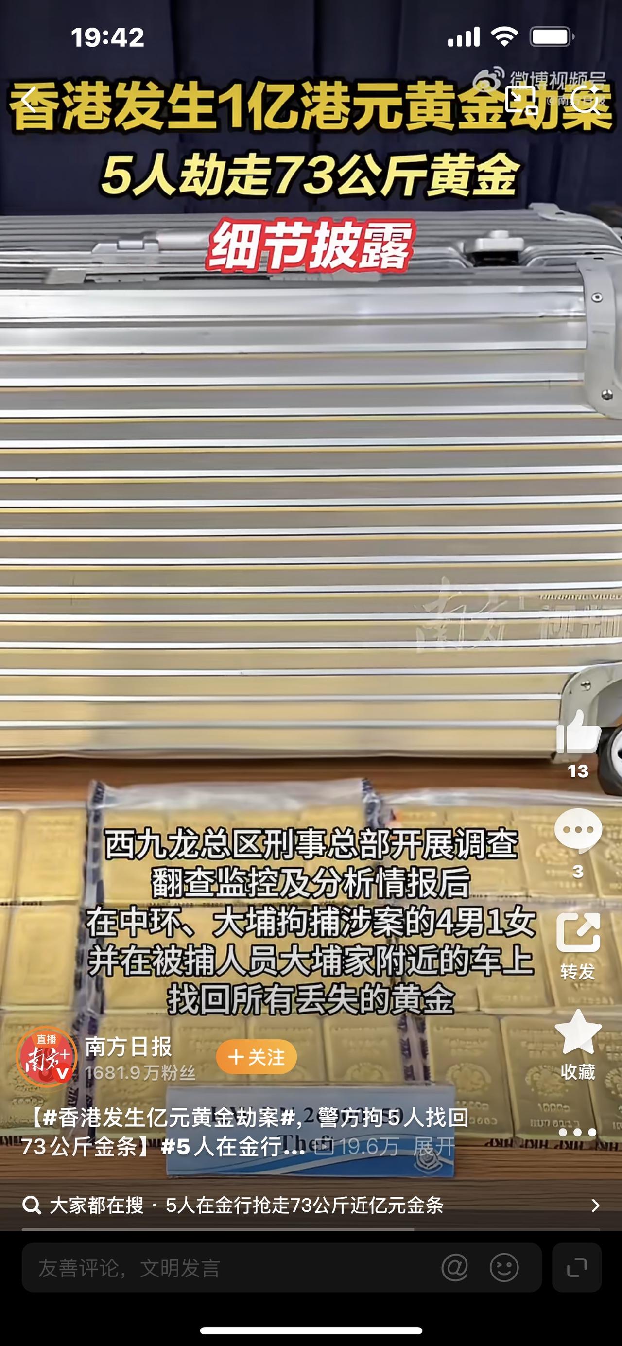 香港突发亿元黄金劫案!73公斤金条被劫走,结局大快人心! 惊天大案!香港红磡突然发生亿元黄金大劫案,73根、总重73公斤的金条被一伙人当众抢走,价值接近1亿港元,消息一出全网炸锅! 光天化日、闹市街区,竟敢明目张胆抢黄金?不少人看完倒吸一口凉气:这也太嚣张了! 更让人震惊的是作案手法:熟人作案、精心布局。一人伪装成大客户,以“隐私交易”为由支开安保;同伙立刻冲进场内,假借债务纠纷制造混乱,短短几分钟,就把满满一箱金条装车逃离。 计划周密、配合默契,本以为是一场“完美犯罪”,不少网友都替金行捏把汗:这么多黄金,还能找回来吗? 反转来了! 本以为劫匪能逃之夭夭,结果碰上了香港警方神速破案。 接警后,警方调取监控、锁定轨迹、布控抓捕,只用了几个小时,就在中环、大埔等地,将4男1女团伙一网打尽!更解气的是:73公斤黄金一根不少,全部追回! 从案发到人赃并获,速度快到离谱,网友直呼:香港警方,太牛了! 这场看似惊险的黄金大劫案,最终以零损失、全抓获圆满收场。 这也给所有人提了个醒:天网恢恢,疏而不漏。再精密的算计,也逃不过法律的制裁;再嚣张的气焰,在正义面前也不堪一击。 金钱诱惑再大,也别碰违法红线;财富再诱人,也要走正路。 守法才安稳,平安才是福。 黄金丢失案 黄金抢窃案 香港黄金失窃案