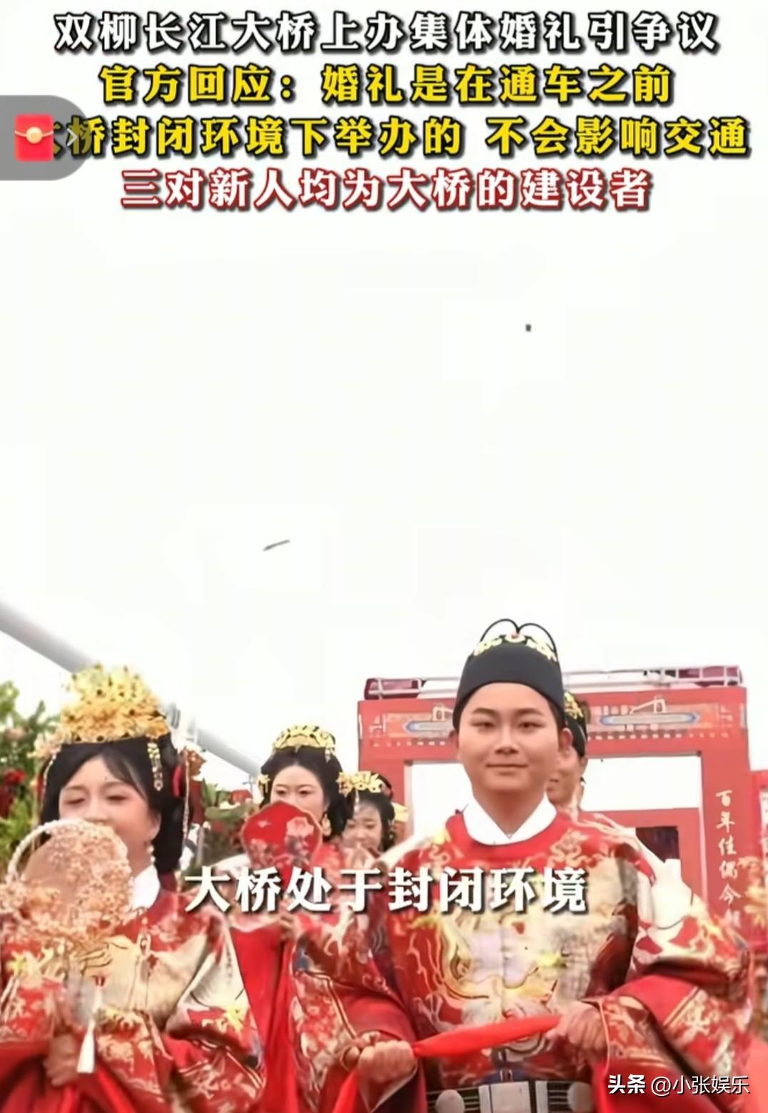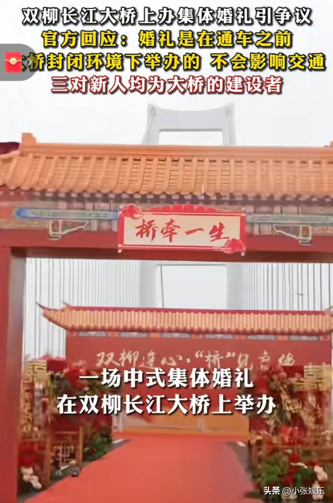 “这也太浪漫了吧”,3月18日湖北武汉,三对新人在双柳长江大桥办中式集体婚礼。 结果被网友骂“占道添堵”,可真相一出来,大家纷纷道歉:“是我格局小了!” 为什么发生反转了呢? 原来这场婚礼的主角,全是双柳长江大桥的建设者!为了建这座世界级大桥,他们把婚期一推再推,把青春都“焊”进了钢筋水泥里。 大桥还没通车,婚礼是在封闭的桥面上办的,压根不影响交通。 你看婚礼现场,红地毯从桥头铺到仪式台,“桥见良缘”的拱门特别醒目,新人们穿着传统中式礼服,在江风里完成拜天地。 这多浪漫呀,那些掐头去尾举报的,是不是羡慕人家呀? 到了3月19日,官方回应了:“三对新人都是建设者,婚礼在封闭环境、保障安全的前提下办的,不影响交通。” 这下网友们才恍然大悟,原来这不是占道,是工程人独有的浪漫啊! 有人说:“人家建桥时没日没夜,婚礼在自己建的桥上办一次,怎么就不行了?”还有人感慨:“以桥为媒,江水为证,这婚结得太硬核了!” 您怎么看?